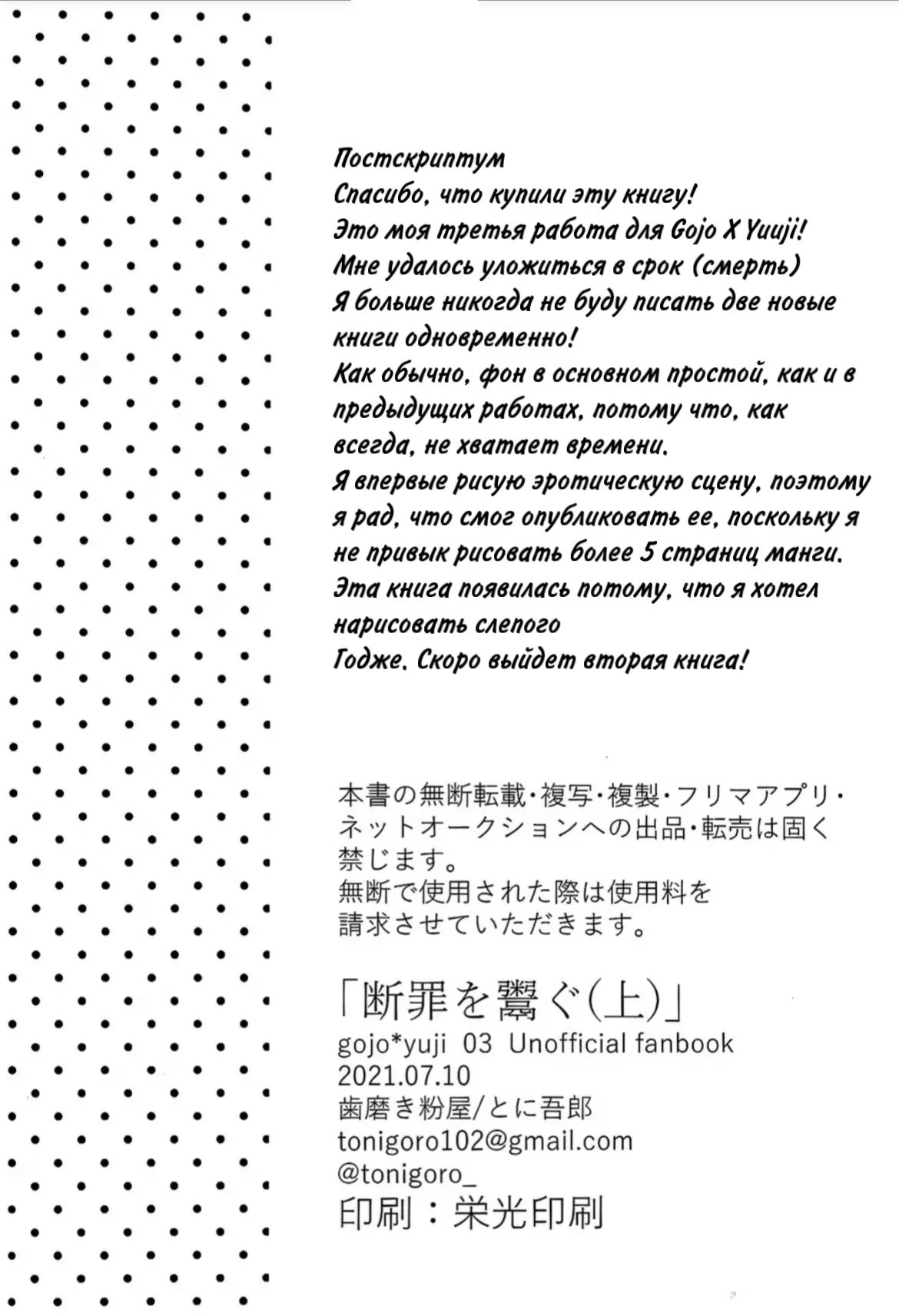 Jujutsu Kaisen dj – Condemnation (Осуждение) 1 Глава 1 2023-12-23 Показать все Читаем: Том: 1. Глава 1 ⬇ Пред глава ⬆ След глава Jujutsu Kaisen dj – Condemnation (Осуждение) 33 0 23 Дек 2023 в 0:00 00 0 Поделиться Переводчики: rayzzzs Категории: яойдодзинсиисторияперерождениеисекай Теги: манга Годжо Сатору / Итадори Юджи Комментарии 0 Добавить Отправить Комментариев еще нет. Вы можете стать первым Похожее Zenbu hajimete (Всё впервые) 10 месяцев назад 00 0 1 Trouble Double Face (Проблемы Раздвоения Личности) 12 лет назад 00 0 1 The Seven Things I'm Sorry For (Семь вещей, о которых я жалею) 13 лет назад 00 0 1 Sweet Mobile Lover (Сладкий Мобильный Возлюбленный) 7 лет назад 00 0 7 Shiawase no jumon - Jujutsu Kaisen dj (Заклинание счастья) 3 года назад 00 0 1 Shi ni itaru tsumi (Смертный грех) 14 лет назад 00 0 1 Saiyuki dj - Carlet Night (Ночь винного цвета) 14 лет назад 00 0 1 Saiyuki dj - Kimi no Tsumi Boku no Ame (Твой грех Мой дождь) 11 лет назад 00 0 1 Saiyuki dj - Sunflower (Подсолнух) 14 лет назад 00 0 1 Revenge! (Реванш!) 14 лет назад 00 0 5 One beer for two (Одно пиво на двоих) 4 месяца назад 00 0 7 Nise x Koi Boyfriend dj - Henshin Shichau (Перевоплощение!?) 9 лет назад 00 0 1 Ngon gio doi toi (Ветер моей жизни) 3 года назад 00 0 36 March the third (Третье марта) 8 лет назад 00 0 39 Love Life (Личная жизнь) 11 лет назад 00 0 5 Kitto Kiss o Suru Toki (Уверен, что когда мы поцелуемся...) 9 лет назад 00 0 10 Kimi no Nioi ga Suki (Мне нравится твой запах) 3 года назад 00 0 10 Kichiku, Encount (Случайная встреча) 9 лет назад 00 0 7 JukeBOX vol.13 (Музыкальный автомат Том 13) 13 лет назад 00 0 1 Jujutsu Kaisen dj - Tokkyuukyoshi no kimamanahi (Беззаботные деньки сильнейших учителей-придурков) 9 месяцев назад 00 0 1 Jujutsu Kaisen dj - Trial and Reprise 4 года назад 00 0 1 Jujutsu Kaisen dj - Wait Until It Becomes a Bouquet (Подожди, пока он не превратится в букет) 1 год назад 00 0 1 Jujutsu Kaisen Dj - What are you doing (Что ты творишь?) 1 год назад 00 0 1 Jujutsu Kaisen dj - Won ane gachigil baraneun sinege gonneneun wanjonhan (Идеальное подношение Богу, надеющемуся на удачу) 9 месяцев назад 00 0 1 Jujutsu Kaisen dj - Zhan Qian Fu Ji (Нападение в поезде) 1 месяц назад 00 0 1 jujutsu kaisen dj – deliveryman and apartment complex wife (Доставщик и жена жилого комплекса) 3 года назад 00 0 1 Jujutsu Kaisen dj – Iritai (Впусти меня) 4 года назад 00 0 1 Jujutsu Kaisen dj – Kimi Ni Sasagu («Посвящаю тебе») 2 года назад 00 0 1 Jujutsu Kaisen dj – Kiss/Goodbye. (Поцелуй/Прощай.) 3 года назад 00 0 1 Jujutsu Kaisen Dj – Sweet Trap (Сладкая ловушка) 1 месяц назад 00 0 1 Jujutsu Kaisen dj – Terminal Lucidity (Терминальная вспышка) 2 года назад 00 0 1 Jujutsu Kaisen dj – Tokiwa's Shadow (Тень Токивы) 3 года назад 00 0 1 Jujutsu Kaisen dj - Mekakushi Haiyu Gojo-san to Shinjin AD Itadori-kun (Актер с повязкой на глазах Годжо-сан и новичок помощник режиссера Итадори-кун) 3 года назад 00 0 1 Jujutsu Kaisen dj - Mekakushi Haiyu Gojo-san to Shinjin AD Itadori-kun 2 (Актер с повязкой на глазах Годжо-сан и новичок помощник режиссера Итадори-кун 2) 3 года назад 00 0 1 Jujutsu Kaisen dj - Mob & Goyuu (Моб & Гою) 1 год назад 00 0 1 Jujutsu Kaisen dj - My little star (Моя маленькая звёздочка) 1 год назад 00 0 1 Jujutsu Kaisen dj - Neta koto kaiwao shitewa naranu (Не говори со спящими) 2 месяца назад 00 0 2 Jujutsu Kaisen dj - No body knows (Никому неведомо) 5 месяцев назад 00 0 1 Jujutsu Kaisen dj - Omae to Futari (Вместе с тобой) 1 год назад 00 0 1 Jujutsu Kaisen dj - Petrichor of Gravity (Петрикор притяжения) 1 год назад 00 0 1 Jujutsu Kaisen dj - Prey on (Добыча) 4 года назад 00 0 1 Jujutsu Kaisen dj - Red line (Алой нитью) 6 месяцев назад 00 0 1 Jujutsu Kaisen dj - ROYAL CROWN (Королевская корона) 3 года назад 00 0 1 Jujutsu Kaisen dj - Sensei to (Мы с сэнсеем) 4 года назад 00 0 1 Jujutsu Kaisen dj - Shota Whoregumi (Магическая битва) 3 года назад 00 0 1 Jujutsu Kaisen dj - Shotagumi gets groomed and kinda kidnapped (Ухаживание за Мегуми, и вроде как похищение.) 1 год назад 00 0 1 Jujutsu Kaisen dj - Terminal Lucidity (Отражение закатного солнца) 2 года назад 00 0 1 Jujutsu Kaisen Dj - Time limit (Ограничение по времени) 1 год назад 00 0 1 Jujutsu Kaisen dj - Ao no toburai (Голубой траур) 10 месяцев назад 00 0 1 Jujutsu Kaisen dj - Blue Gift (Голубой подарок) 2 месяца назад 00 