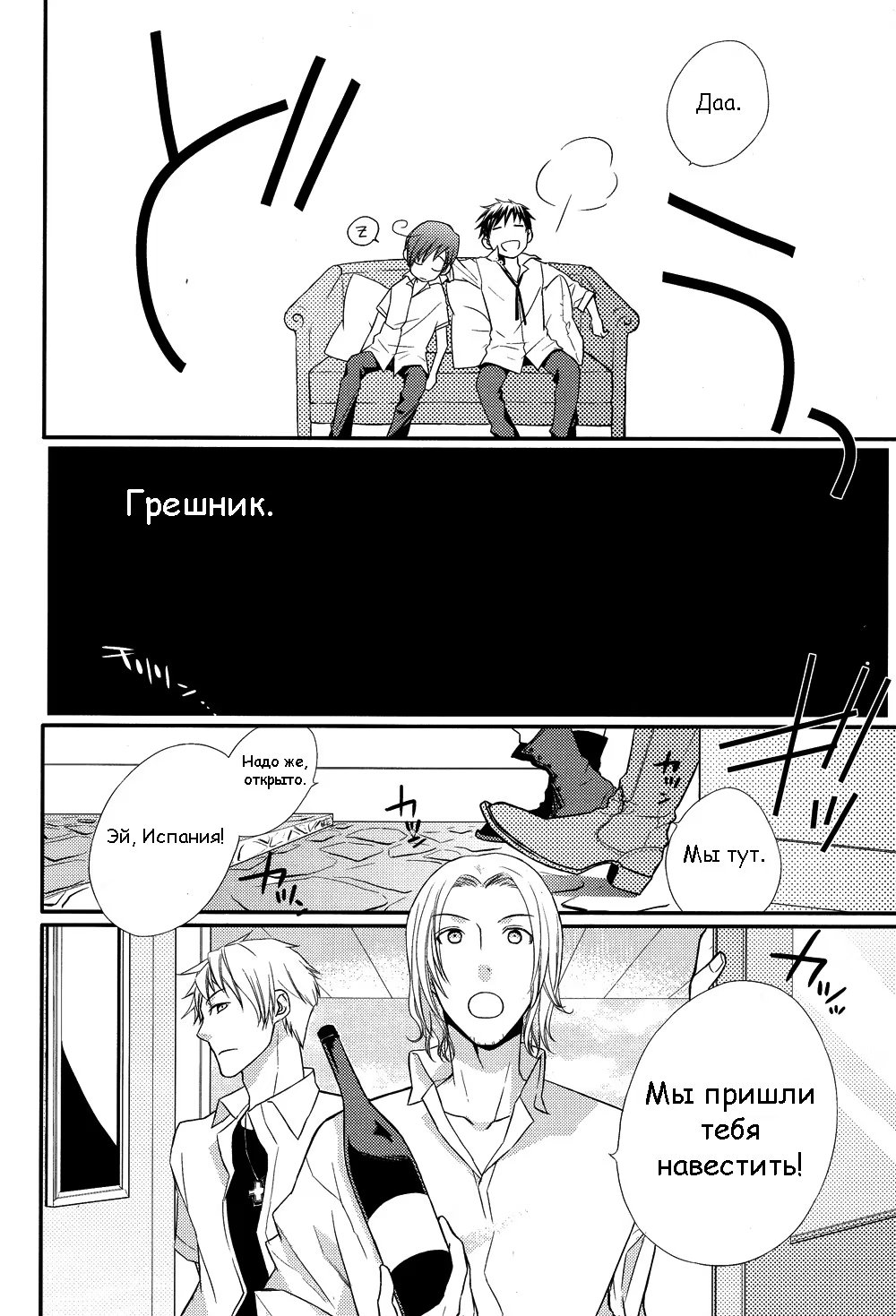 Hetalia dj - Tsumi na Otoko (Грешник) 1 Глава 1 2015-03-16 Показать все Читаем: Том: 1. Глава 1 ⬇ Пред глава ⬆ След глава Hetalia dj - Tsumi na Otoko (Грешник) 19 0 16 Мар 2015 в 0:00 00 0 Поделиться Переводчики: chibi ichibi Категории: яойдодзинси Теги: манга Персонажи: Испания/Романо, Пруссия, Франция. Комментарии 0 Добавить Отправить Комментариев еще нет. Вы можете стать первым Похожее Yoru to Asa no Uta (Песня ночи и утра) 6 лет назад 00 0 8 Yoru wo Nigeru (Скрываясь от темноты) 10 лет назад 00 0 1 Yome ni Konai ka (Стань моей женой!) 12 лет назад 00 0 10 Yajirushi (Стрелка) 6 лет назад 00 0 7 Wane Koi Tsumi 14 лет назад 00 0 1 TIGER&BUNNY dj — Otoko Darake no Onsen Ryokouki (Otoko Darake no Onsen Ryokouki) 13 лет назад 00 0 1 Successful Man (Блестящий бизнесмен) 14 лет назад 00 0 5 Shi ni itaru tsumi (Смертный грех) 14 лет назад 00 0 1 Sensual (Раздевая взглядом) 14 лет назад 00 0 5 Secret and Sun (Солнце и секрет) 10 лет назад 00 0 1 Saiyuki dj - Kimi no Tsumi Boku no Ame (Твой грех Мой дождь) 11 лет назад 00 0 1 Please love me (Пожалуйста, люби меня) 14 лет назад 00 0 6 Osomatsu-san dj - Tsumi wo mitomeru hanashi (История о признании своих грехов) 9 лет назад 00 0 1 Nemuri Otoko to Koi Otoko (Спящий и любящий) 6 лет назад 00 0 3 Matsu Hana (Ожидающий цветок) 12 лет назад 00 0 1 Love in the Afternoon (Любовь после полудня) 14 лет назад 00 0 7 Hetalia dj – Saitei na Futari 10 лет назад 00 0 1 Hetalia dj – Setting Sun (Заходящее солнце) 9 лет назад 00 0 1 Hetalia dj - Your Laws (Hetalia dj - Твои правила) 8 лет назад 00 0 1 Hetalia dj - Yuminabe (Вкуснейшее набэ) 9 лет назад 00 0 1 Hetalia dj – 1950 9 лет назад 00 0 1 Hetalia dj – Aru Ai no Shi to Fumetsu no Koi ni Yosete (Hetalia dj – Смерть любви и бессмертный возлюбленный) 9 лет назад 00 0 1 Hetalia dj – Millmake 10 лет назад 00 0 1 Hetalia dj - Walzer (Вальс) 10 лет назад 00 0 1 Hetalia dj - Wan Li Tiao Yi 10 лет назад 00 0 1 Hetalia dj - Warabeeeeee 10 лет назад 00 0 1 Hetalia dj - We will meet again (Мы встретимся снова) 10 лет назад 00 0 1 Hetalia dj - Wild Flowers (Полевые цветы) 10 лет назад 00 0 1 Hetalia dj - World's fair 10 лет назад 00 0 1 Hetalia dj - This Fire (Hetalia dj - Огонь) 8 лет назад 00 0 1 Hetalia dj - Tu viens chez moi (Ты приехал ко мне?) 10 лет назад 00 0 1 Hetalia dj - Sweet Sweets (Hetalia dj - Сладкие конфеты) 10 лет назад 00 0 1 Hetalia dj - Rilakkumayuge (Рилаккумаюге) 10 лет назад 00 0 1 Hetalia dj - Romano and the Armada (Романо и Армада) 10 лет назад 00 0 4 Hetalia dj - Saint Honey: Christmas (Hetalia dj - Святой мёд: Рождество) 8 лет назад 00 0 1 Hetalia dj - Secret Garden 10 лет назад 00 0 1 Hetalia dj - Secret*Secret (Секрет*Секрет) 12 лет назад 00 0 1 Hetalia dj - Slow waltz (Hetalia dj - Медленный вальс) 10 лет назад 00 0 1 Hetalia dj - Sol y Sombra (Солнце и тень) 9 лет назад 00 0 1 Hetalia dj - Sommer Sommer Sommer (Hetalia dj - Лето Лето Лето) 8 лет назад 00 0 1 Hetalia dj - Paradisus 9 лет назад 00 0 4 Hetalia dj - Please don't say why (Пожалуйста, не спрашивай, почему) 7 лет назад 00 0 1 Hetalia dj - Rain Shower 10 лет назад 00 0 1 Hetalia dj - Mon Vecino 10 лет назад 00 0 1 Hetalia dj - Nero: Solarium (Чёрное солнце) 8 лет назад 00 0 1 Hetalia dj - Next to me (Рядом со мной) 11 лет назад 00 0 1 Hetalia dj - No Crony No Life (Нет пошлости - нет жизни) 9 лет назад 00 0 1 Hetalia dj - Love and Heart Kiss and Sake 10 лет назад 00 0 1 Hetalia dj - Love and Tomato (Любовь и помидорка) 11 лет назад 00 0 1 Hetalia dj - Made in Hell 11 лет назад 00 0 3