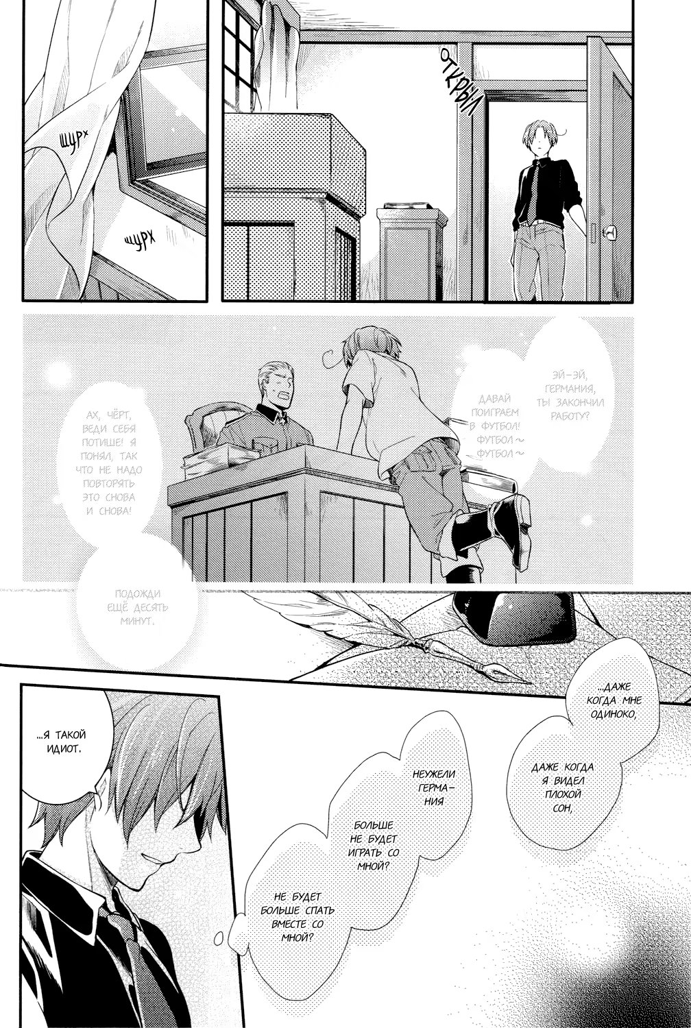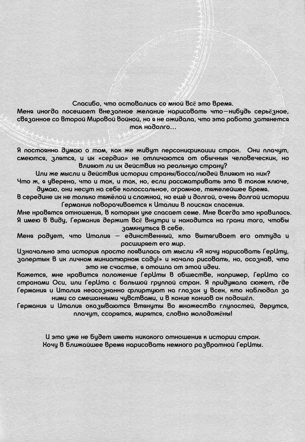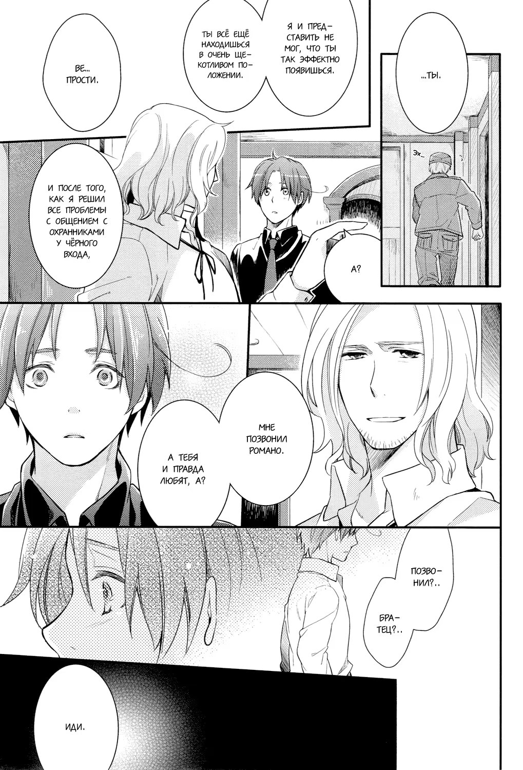 Hetalia dj - Futari Gokko (Наша война) 3 Глава 0 2016-02-12 2 Глава 0 2016-01-16 1 Глава 0 2015-12-21 Показать все Читаем: Том: 3. Глава 0 ⬇ Пред глава ⬆ След глава Hetalia dj - Futari Gokko (Наша война) 59 0 12 Фев 2016 в 0:00 00 0 Поделиться Переводчики: швеция одобряет Категории: романтикаяойдрамадодзинси Теги: манга Пейринг: Германия/Северная Италия Комментарии 0 Добавить Отправить Комментариев еще нет. Вы можете стать первым Похожее Эль Блейз и Кинг (EL BLAZE & THE KING) 7 месяцев назад 00 0 6 Shingeki no Kyojin dj - Ookina Futari to Chiisana Futari (Большие и маленькие) 4 года назад 00 0 1 Hetalia dj – The Dog’s Mood (Hetalia dj – Собачьи прихоти) 9 лет назад 00 0 1 Hetalia dj - Yotogibanashi 11 лет назад 00 0 1 Hetalia dj – Natsu no Mamono (Летнее видение) 9 лет назад 00 0 1 Hetalia dj - Walzer (Вальс) 10 лет назад 00 0 1 Hetalia dj - Sposa di Adria (Невеста Адриатики) 8 лет назад 00 0 1 Hetalia dj - Stamp 1 10 лет назад 00 0 1 Hetalia dj - Stamp 4 10 лет назад 00 0 1 Hetalia dj - Su-Jiku Gate (Врата Оси) 7 лет назад 00 0 1 Hetalia dj - Sweet Home (Милый дом) 10 лет назад 00 0 1 Hetalia dj - Secret Garden 10 лет назад 00 0 1 Hetalia dj - Passato ed Ora 12 лет назад 00 0 1 Hetalia dj - Promised Land 10 лет назад 00 0 1 Hetalia dj - Natsu no Mamono (Призрачное лето) 7 лет назад 00 0 1 Hetalia dj - Okubyoumono no Koufuku (Счастье труса) 9 лет назад 00 0 1 Hetalia dj - Love Slave 10 лет назад 00 0 1 Hetalia dj - Love Therapy (Любовная терапия) 10 лет назад 00 0 1 Hetalia dj - Mawata no Koi (Любовь, охватившая моё сердце шёлковой нитью) 10 лет назад 00 0 1 Hetalia dj - Messenger of Happiness (Посланник счастья) 10 лет назад 00 0 1 Hetalia dj - Kyouren 10 лет назад 00 0 1 Hetalia dj - Inori no Niwa (Сад молящихся) 9 лет назад 00 0 1 Hetalia dj - Kami-sama to Sono Hoka no Henshu (Бог и его проявления) 6 лет назад 00 0 1 Hetalia dj - I can do it myself! (Я сам со всем справлюсь!) 10 лет назад 00 0 1 Hetalia dj - Il Cielo Sulla Terra! 10 лет назад 00 0 1 Hetalia dj - Gattino Nante Iwasenai (Не смей звать меня котёнком) 10 лет назад 00 0 1 Hetalia dj - Happy Days (Счастливые Дни) 10 лет назад 00 0 1 Hetalia dj - Heated Gaze (Хеталия и страны Оси dj - Теплый взгляд) 14 лет назад 00 0 1 Hetalia dj - e.m 9 лет назад 00 0 1 Hetalia dj - Eternita (Вечность) 11 лет назад 00 0 1 Hetalia dj - Demigod (Revised Edition) (Полубог) 9 лет назад 00 0 1 Hetalia dj - Der erste Stern (Первая звезда) 10 лет назад 00 0 4 Hetalia dj - Diamante! (Алмаз!) 11 лет назад 00 0 1 Hetalia dj - Disce Gaudere (Научиться наслаждаться) 8 лет назад 00 0 1 Hetalia dj - Dolfin 13 лет назад 00 0 4 Hetalia dj - Dreams Draws a Dreams (Мечты рисуют сны) 9 лет назад 00 0 1 Hetalia dj - Aitei kanzenchoukyou (Дрессировка любимого братца) 8 лет назад 00 0 1 Hetalia dj - Aru Otoko no Haiboku (Мое поражение) 12 лет назад 00 0 2 Hetalia dj - 365 (Хеталия и страны Оси dj - 365) 5 лет назад 00 0 1 Hetalia dj - A Day on the Planet (Один день на планете) 8 лет назад 00 0 2 DRAMAtical Murder dj - Futari no Mondai (Наша проблема) 11 лет назад 00 0 1