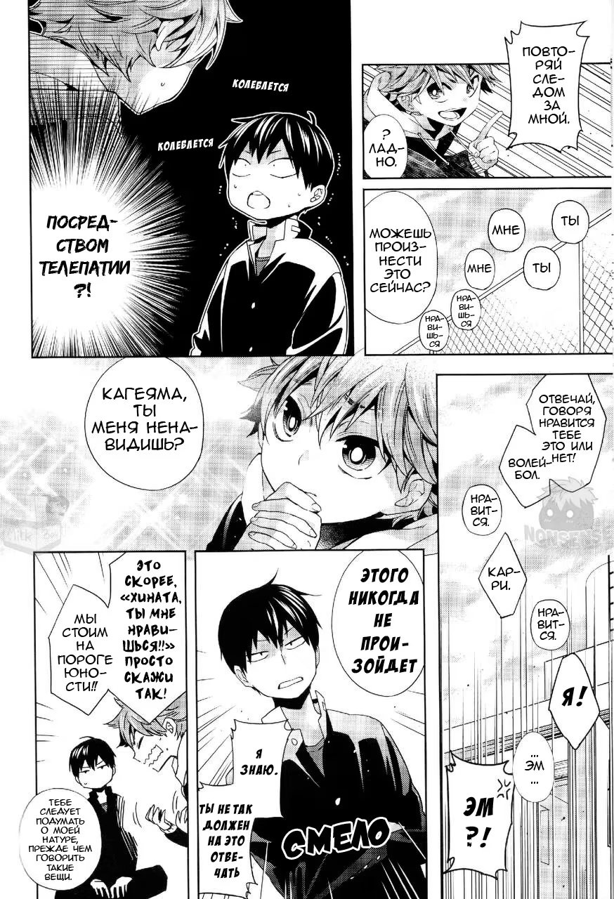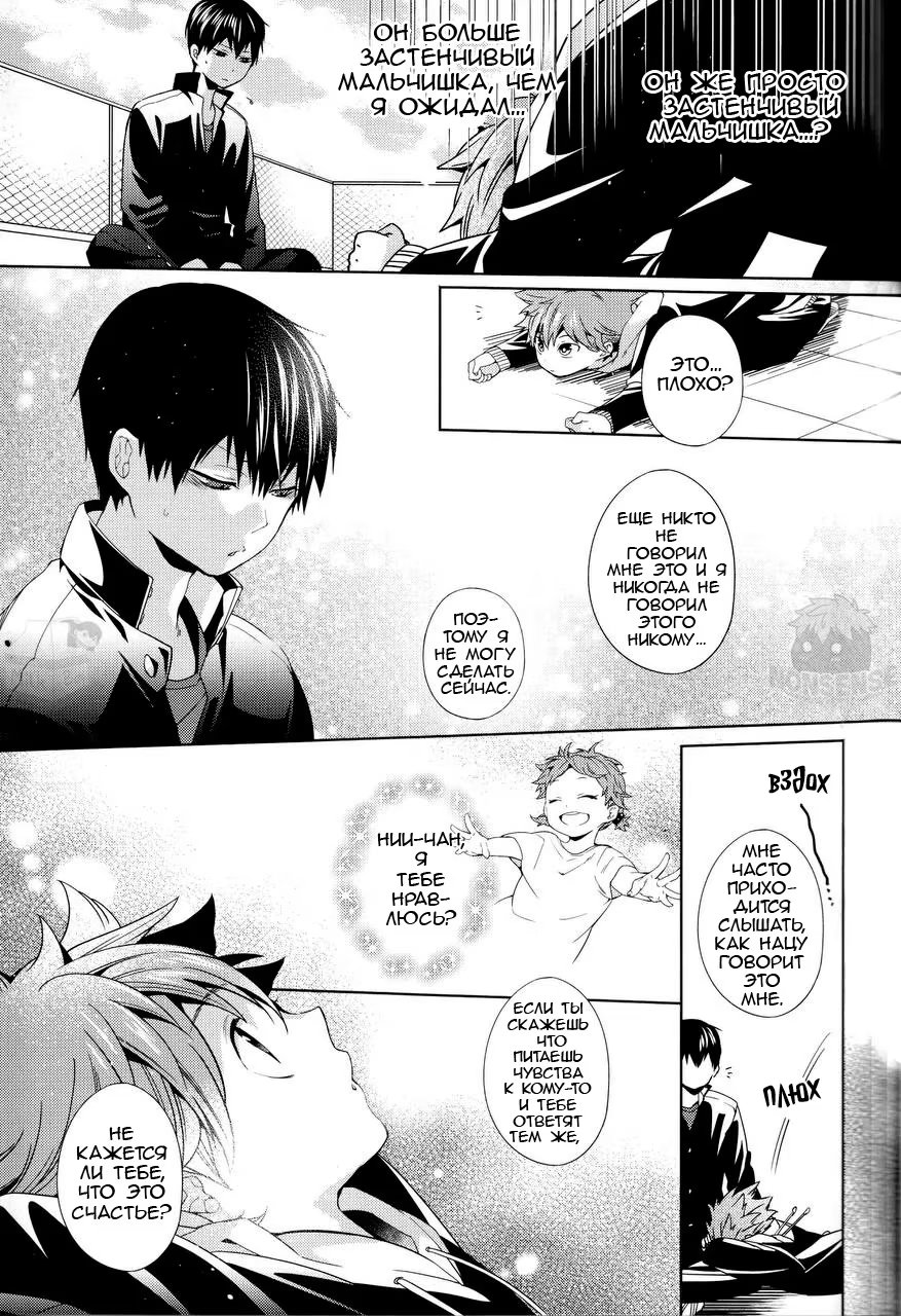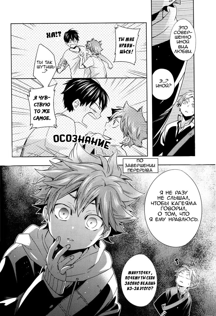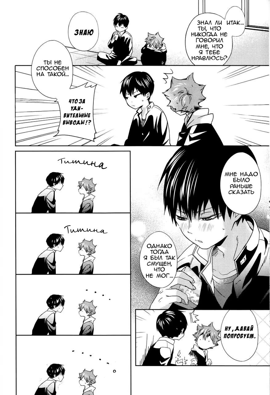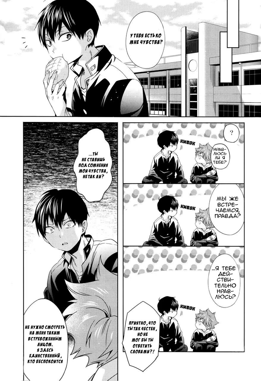Хината понимает, что он никогда не слышал, чтобы Кагеяма говорил, что он ему нравится, хотя они уже начали встречаться! Какие дурацкие шаги он предпримет, чтобы исправить эту оплошность?
