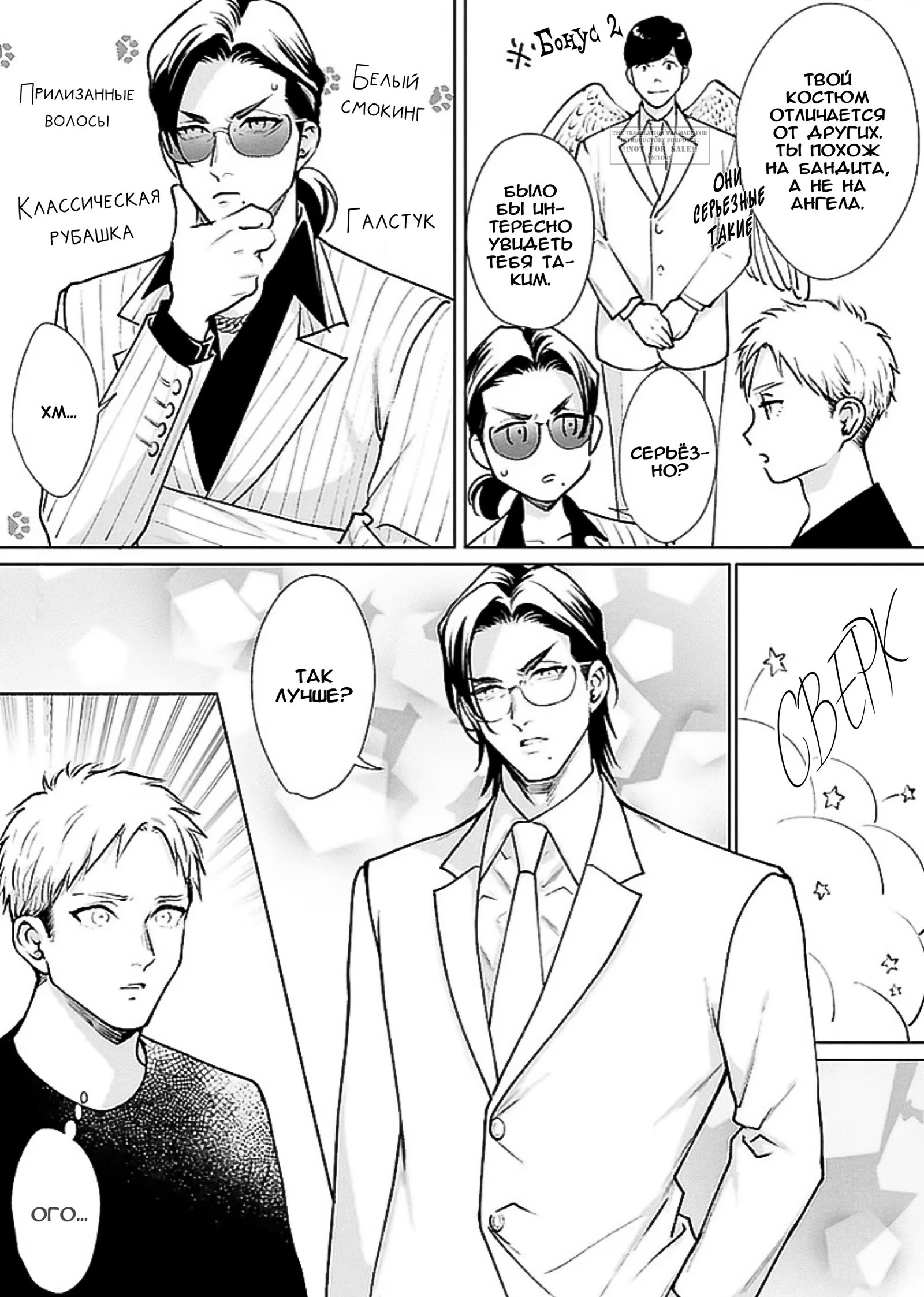 victoryКак часто, выйдя из душа, вы видите в своей комнате незнакомого мужика, выглядящего как якудза? Вот и Курой столкнулся с таким впервые. Только мужик говорит, что никакой он не якудза, а ангел, пришедший по душеньку Куроя. Стоит ли ему верить? На Небесах-то какие-то неполадки - придётся разбираться на месте.