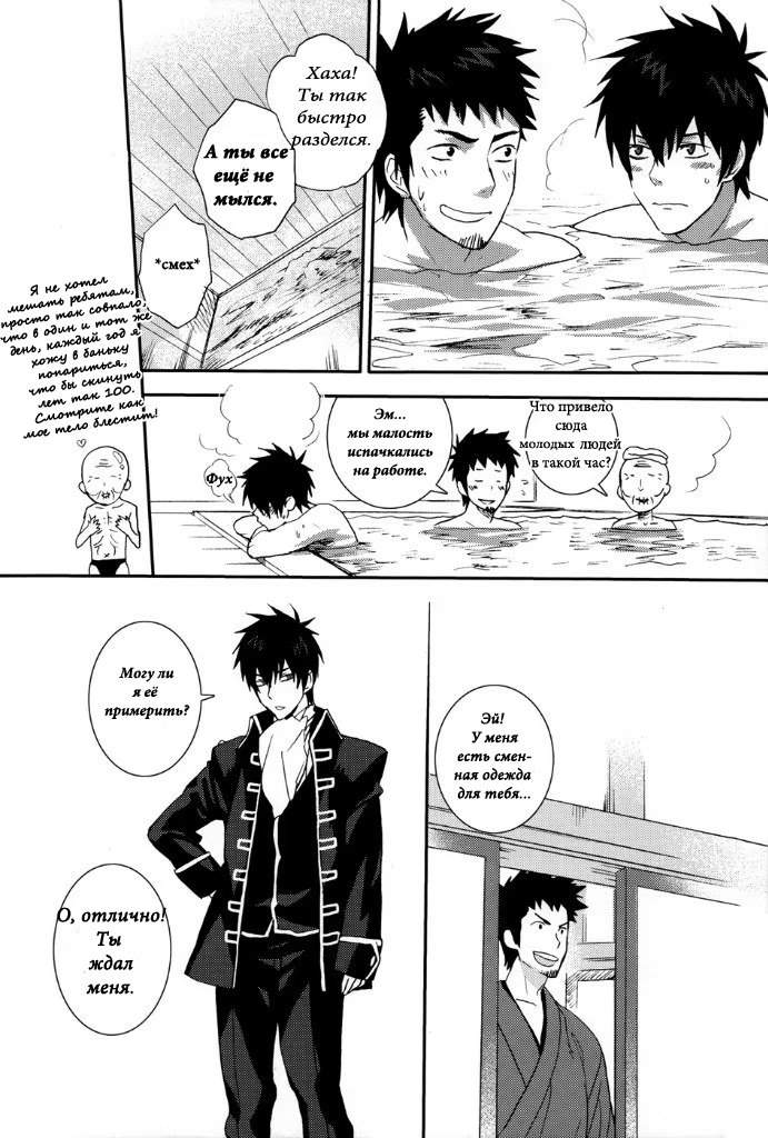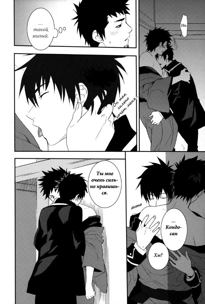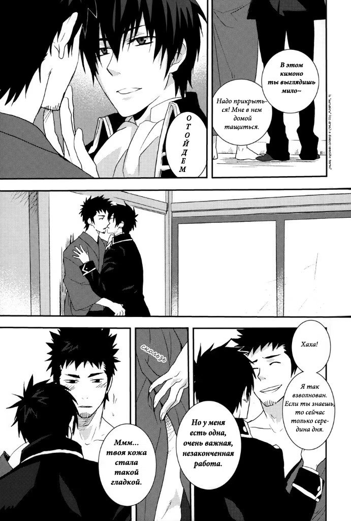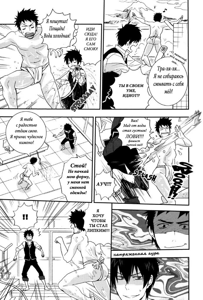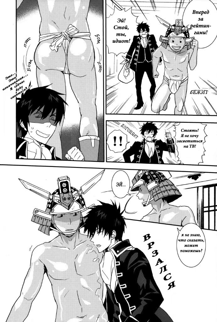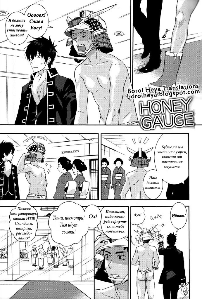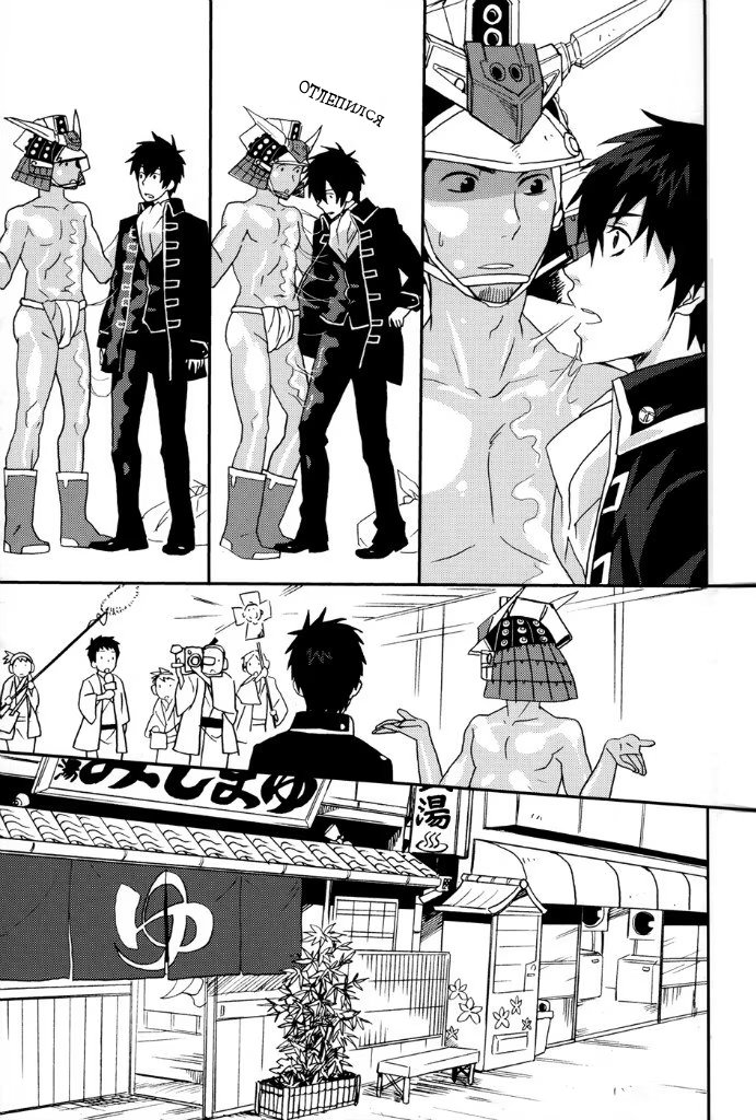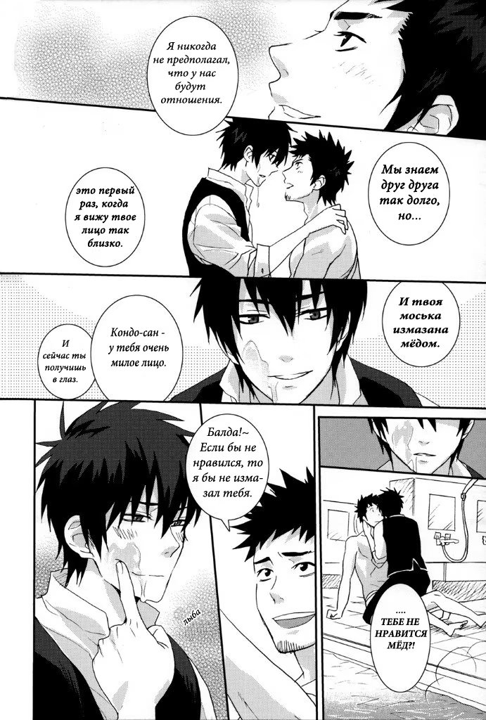 mozgovnetСёгун купился на то, что его любимец Руримару вследствии неких обстоятельств превратился в человека и отпустил "жука" с миром. После этого Хиджиката повёл Кондо-сана (а это, несомненно, был он XD) отмываться в баню, но по неосторожности сам испачкался в мёде. Ему тоже пришлось пойти мыться, но всё бы ничего, если бы Кондо вдруг не взбрело в голову окунуть замкома насильно))) :DDD