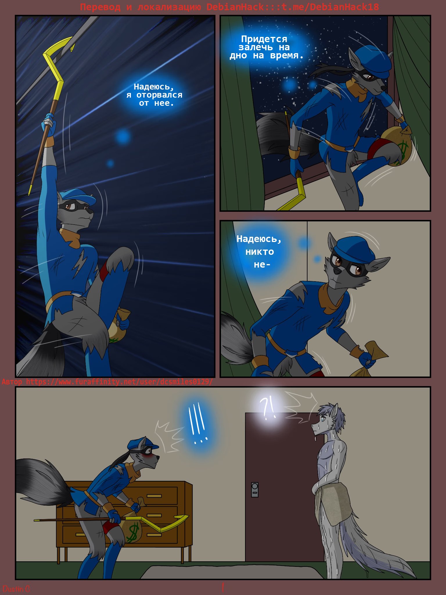 debianhackКомикс повествует о как Слай Купер, известный вор енот, в попытке скрыться, попадает в квартиру рандомного чела-акулы. Как мы знаем Слай вор, а не убийца и его надо решить, как заставить чела молчать. Как он это сделает, смотрите в комиксе, хихихи Читаем))