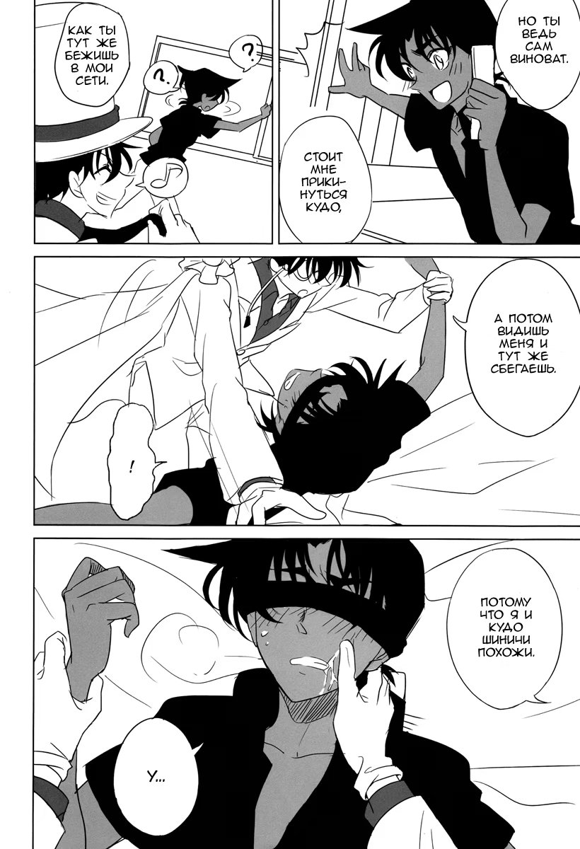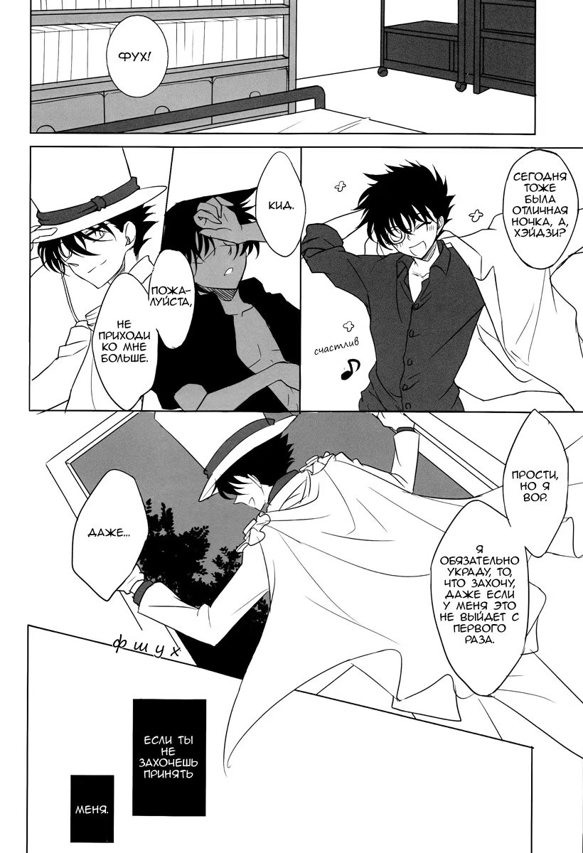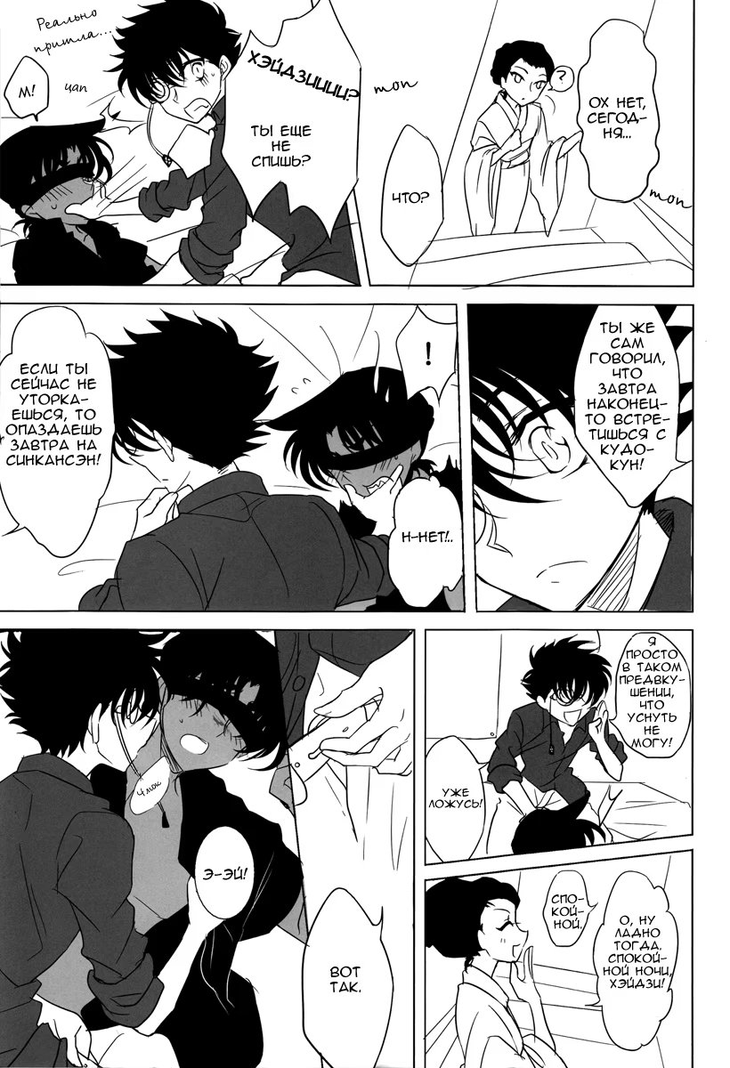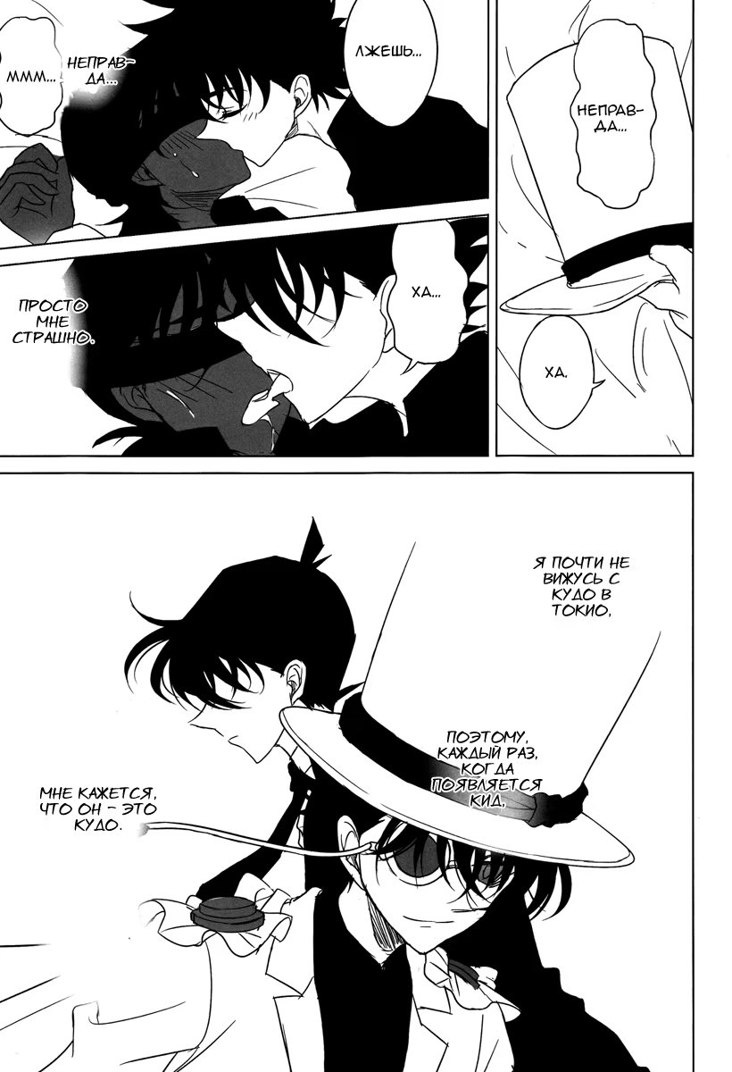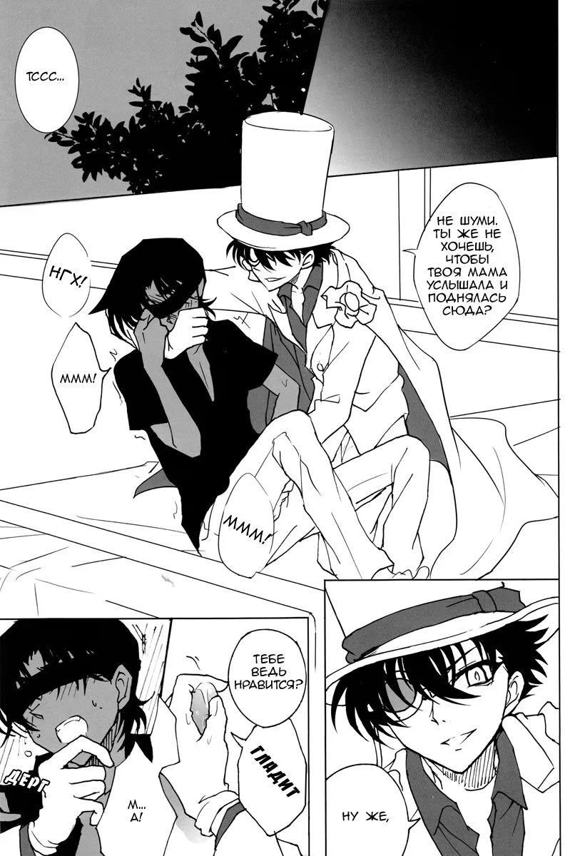 коробка со специямиХэйджи собрался ехать в Токио, чтобы навестить Шиничи. Он тайно в него влюблён, о чём тот не догадывается. Но этим обстоятельством нагло пользуется Кайто Кид. Он тайно навещает Хэйджи, чтобы используя голос Шиничи, соблазнить его. И в эту ночь он приходит в Осаку к молодому детективу...