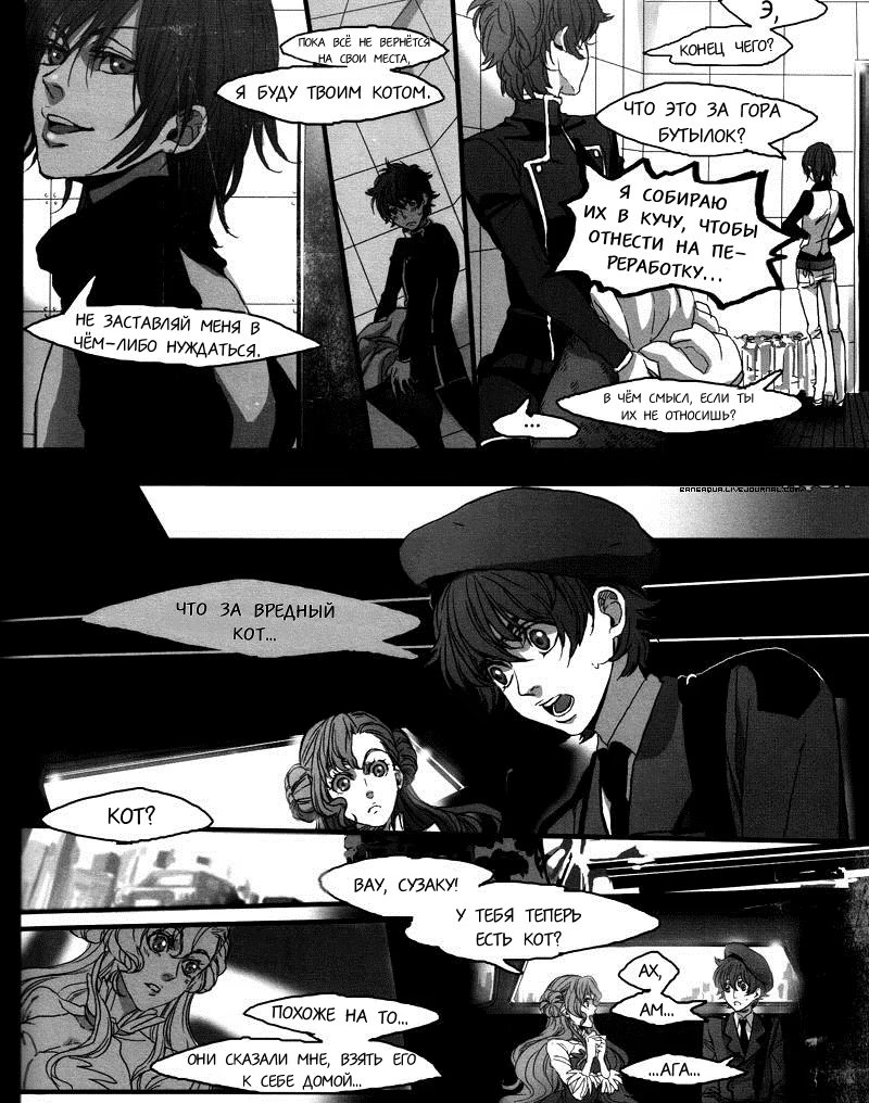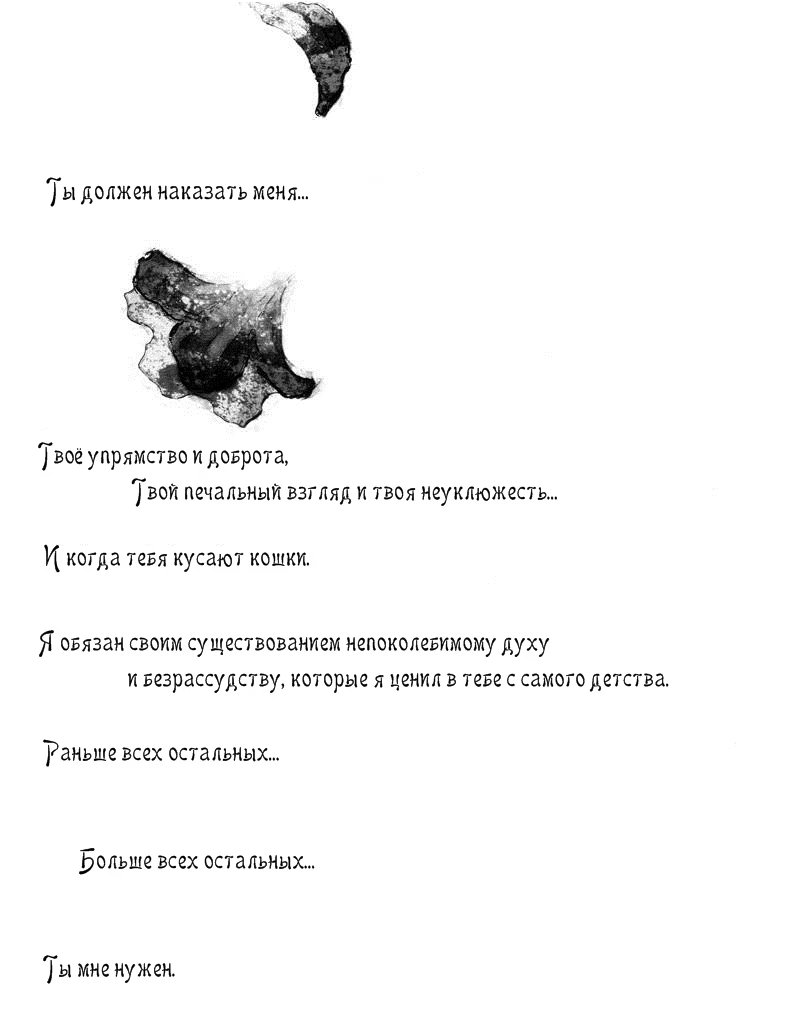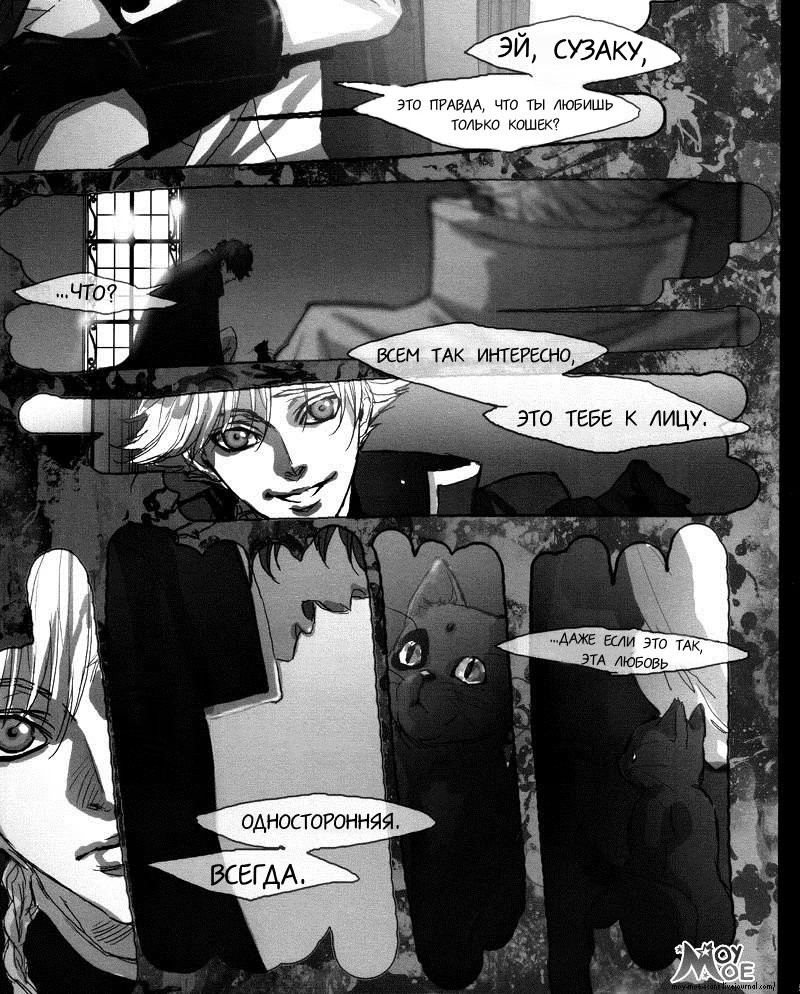 весенняя тишина"Это так тяжело, любить человека, который желает твоей смерти. А так порой хочется сковать его сердце со своим, стащить его с того пути, который он так настойчиво выбрал. Просто быть рядом с ним, чувствовать его прикосновения. Наверное, для этого мне лучше стать котом. И даже если у меня это выйдет, волшебство всё равно рано или поздно закончится и придёт время проснуться. Встреча с реальностью пугает меня, ведь там ты совсем не мой, а дыру в твоём сердце занял другой человек."