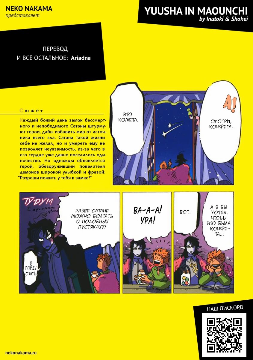 neko nakamaКаждый божий день замок бессмертного и непобедимого Сатаны штурмуют герои, дабы избавить мир от источника всего зла. Сатана такой жизни себе не желал, но и умереть ему не позволяет неуязвимость, из-за чего в его сердце уже давно поселилось одиночество. Но однажды объявляется герой, обезоруживший повелителя демонов широкой улыбкой и фразой: "Разреши пожить у тебя в замке!"