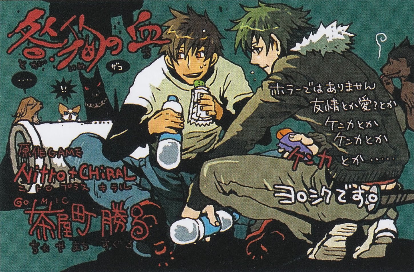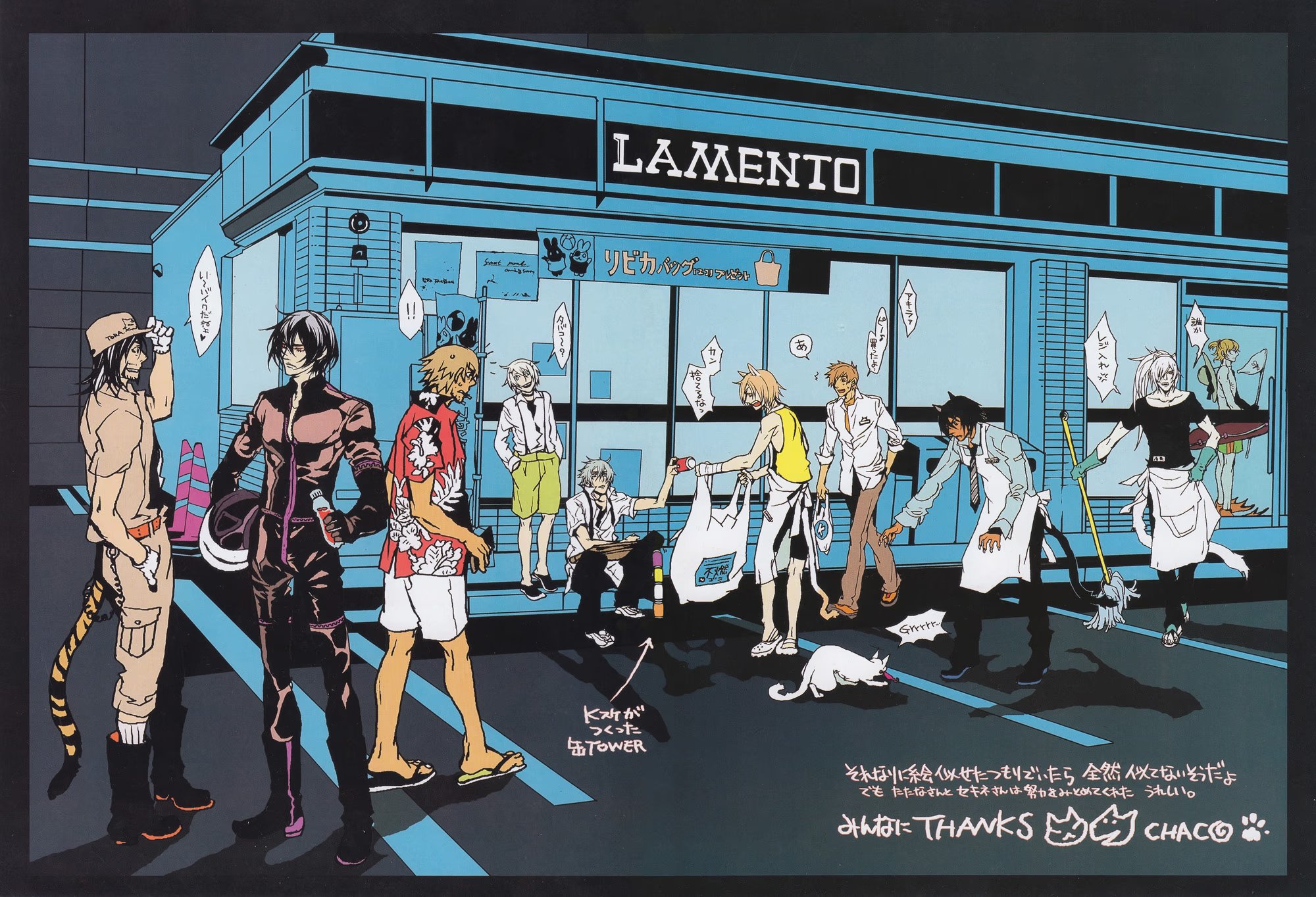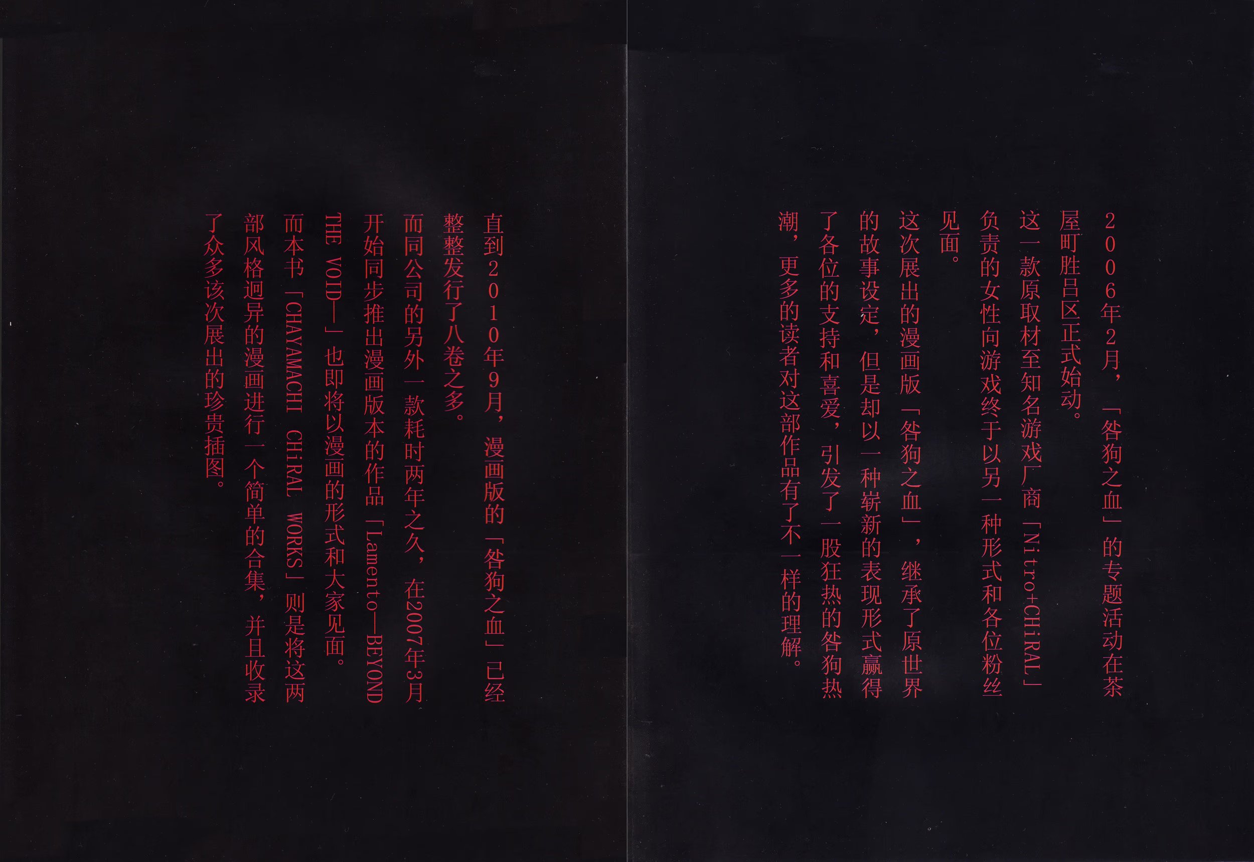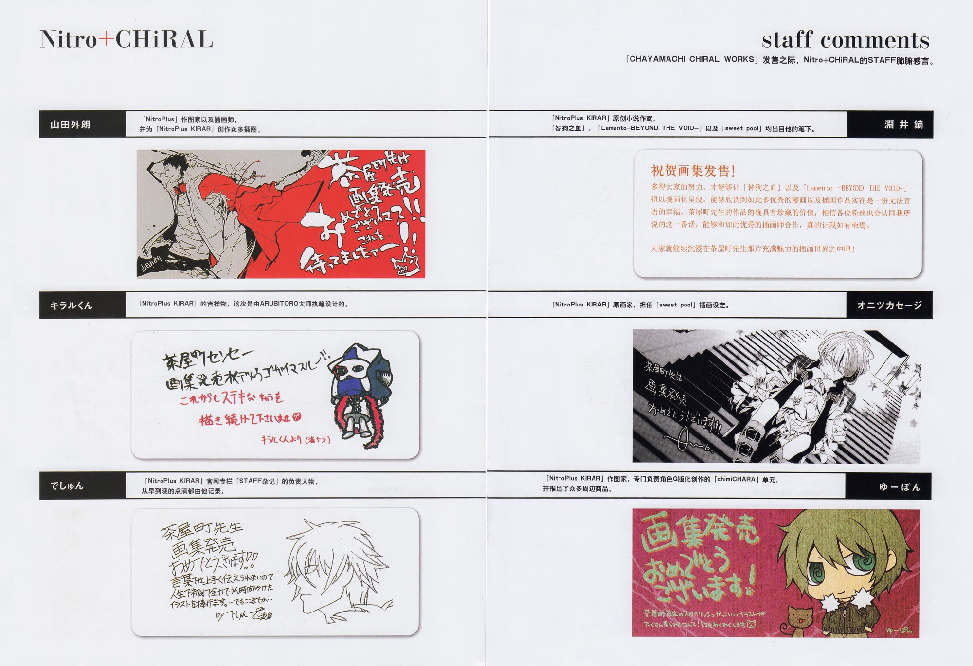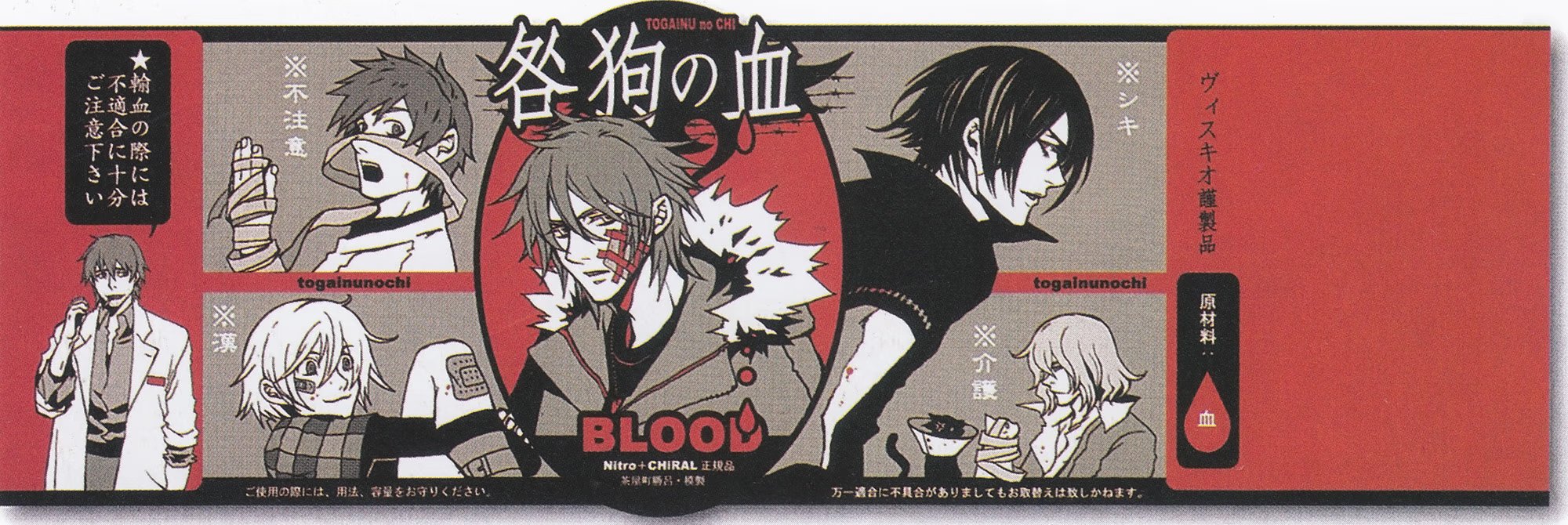 heavenceyАртбук «Chayamachi CHiRAL Works», выпущенный в 2010 году, включает в себя серию коротких эксклюзивных рассказов «After Story» по «Togainu no Chi», написанных сценаристкой игры Фути Кабура о жизни героев после финала новеллы, серию стилизованных иллюстраций «Togainu no Chi», «Lamento -Beyond the Void-» и «Sweet Pool» от автора манги-адаптации «Togainu no Chi» Таямати Сугуро, а также короткую мангу из альтернативной вселенной: «Круглосуточный магазинчик Ламенто» («Convenience Store Lamento») – кроссовер, в котором присутствуют персонажи из «Togainu no Chi» и «Lamento -Beyond the Void-» (в данный сборник не входит).