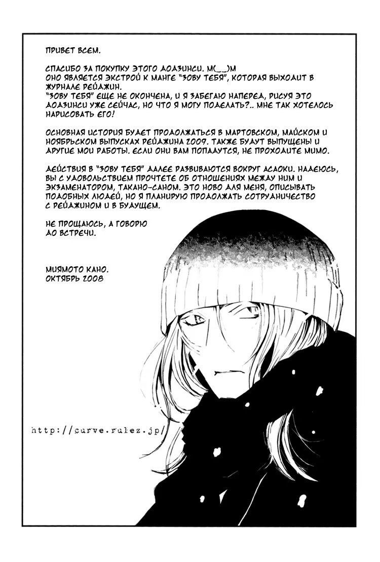 call of the windЭта додзинси является экстрой к манге «Зову тебя». Она связывает между собой Cики (Нисикиoри Дзюна) и Асаоку Сино, вокруг которого развиваются события в продолжении цикла «Зову тебя».