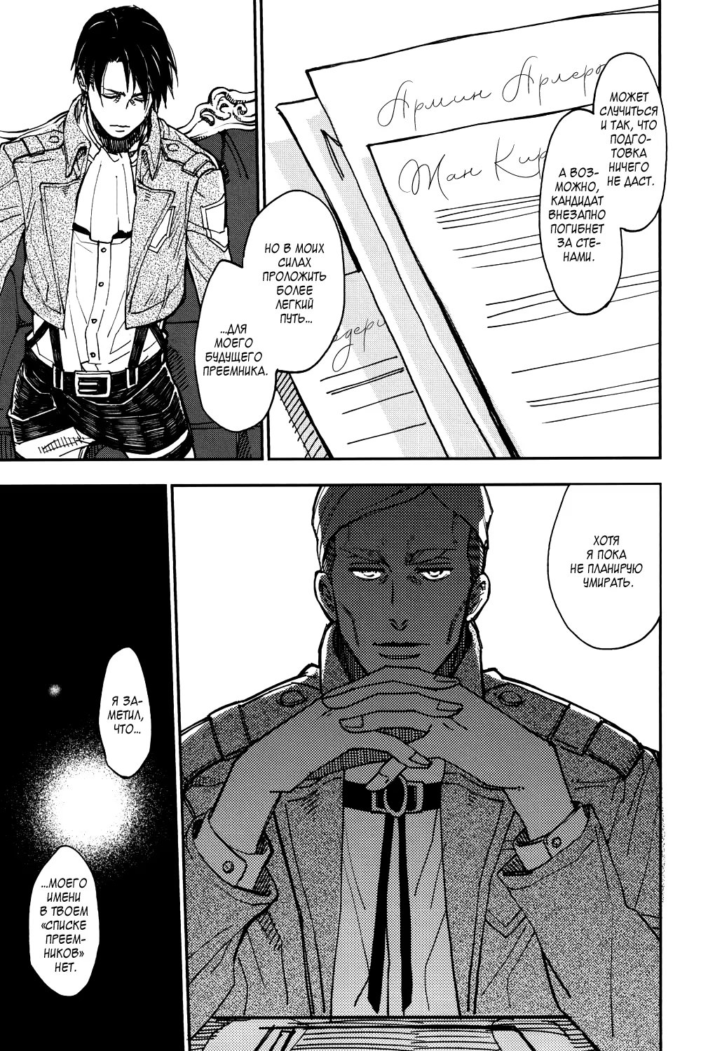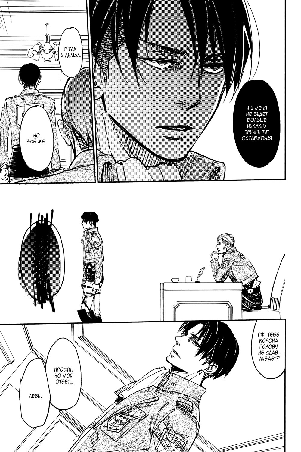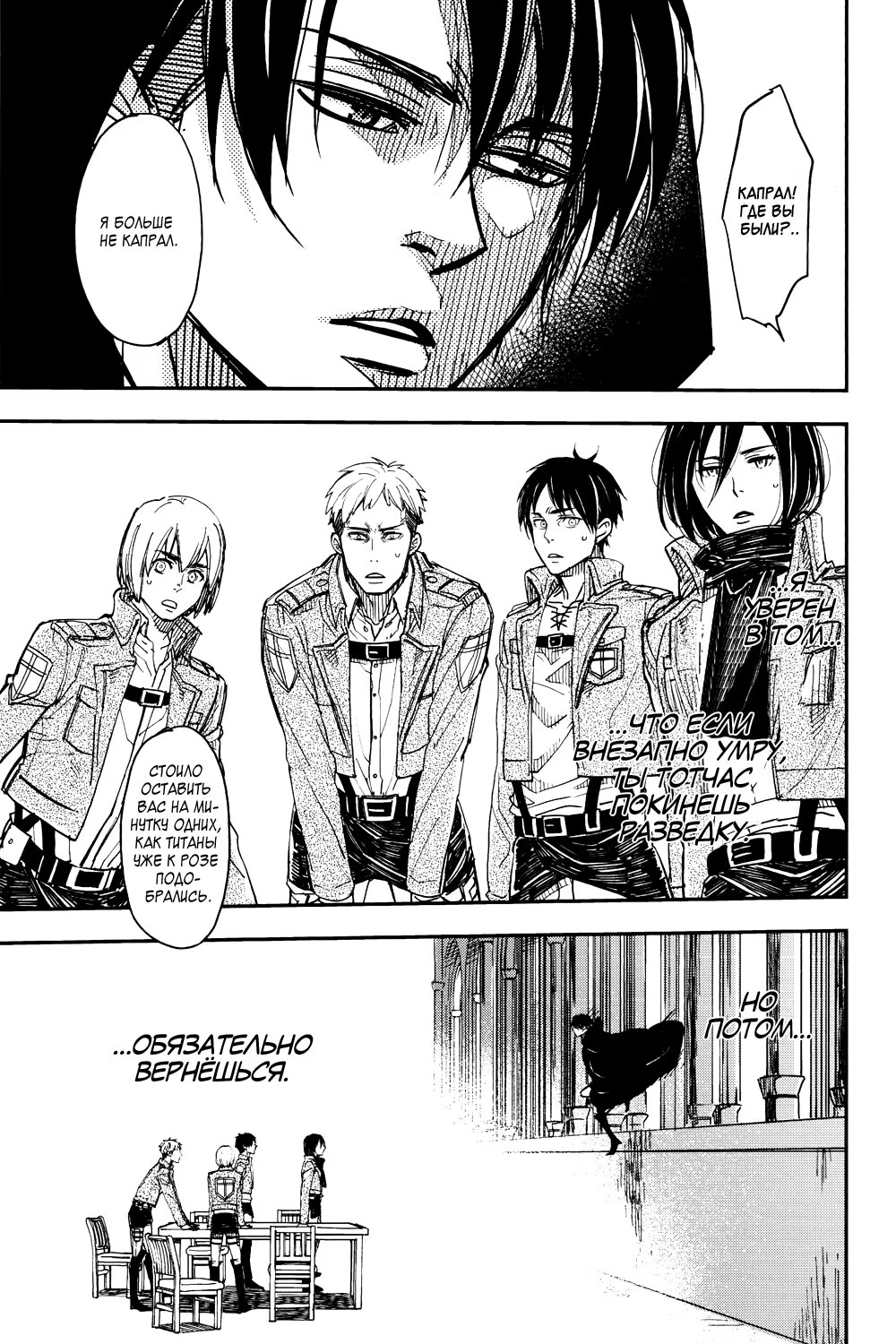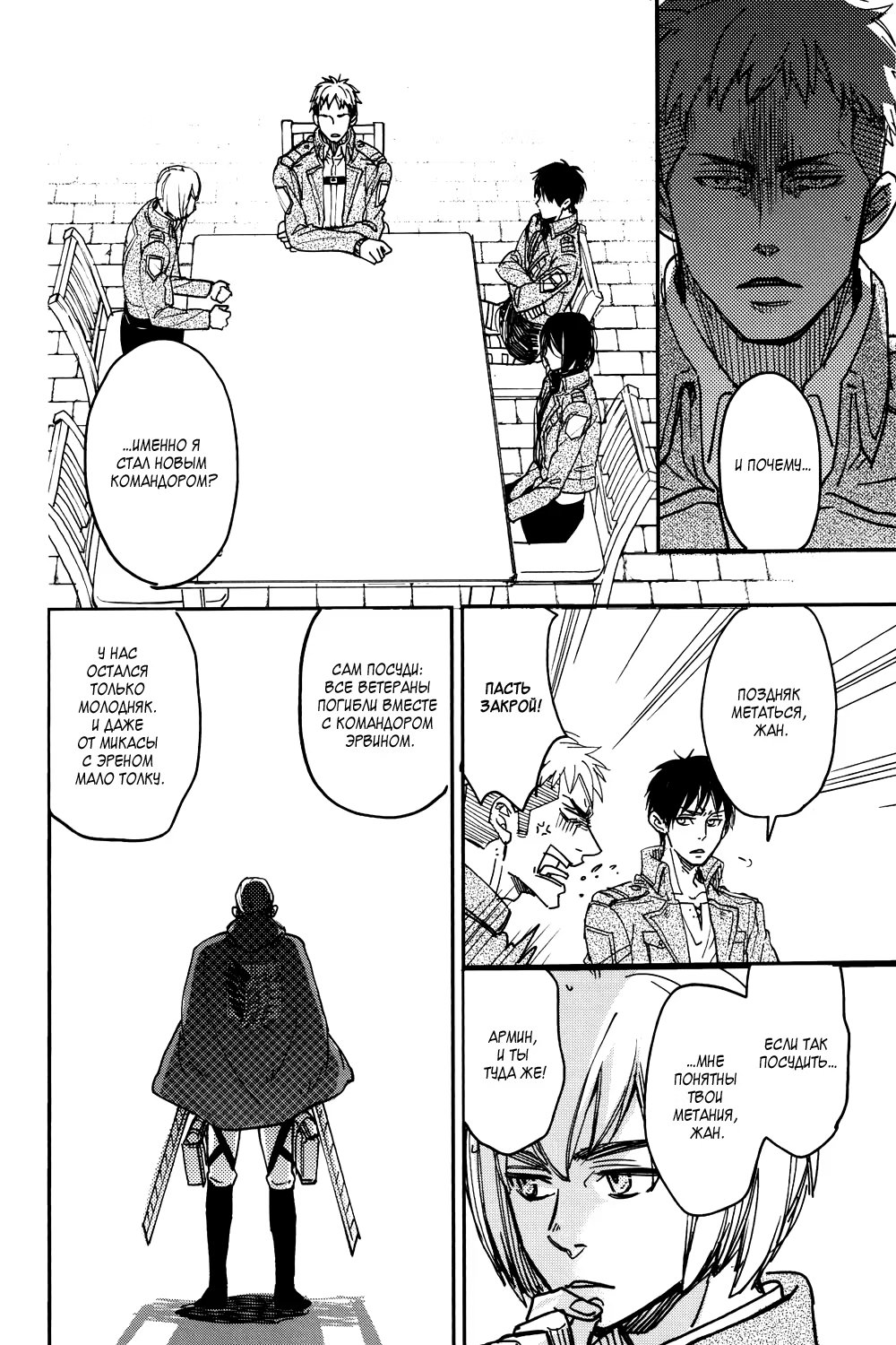 Альтернативное развитие событий: во время очередной миссии Эрвин погибает, и Леви тотчас уходит из Разведкорпуса в неизвестном направлении. Эрен, Микаса, Армин и Жан пытаются хоть как-то стабилизировать хаос, который за этим следует. Но, когда они уже совсем отчаиваются со всем справиться, им неожиданно наносят визит...