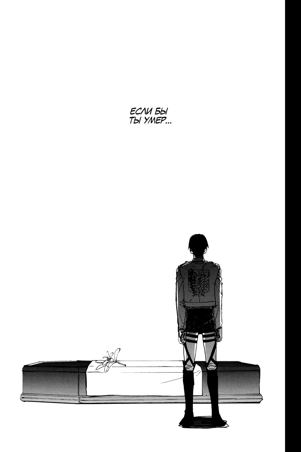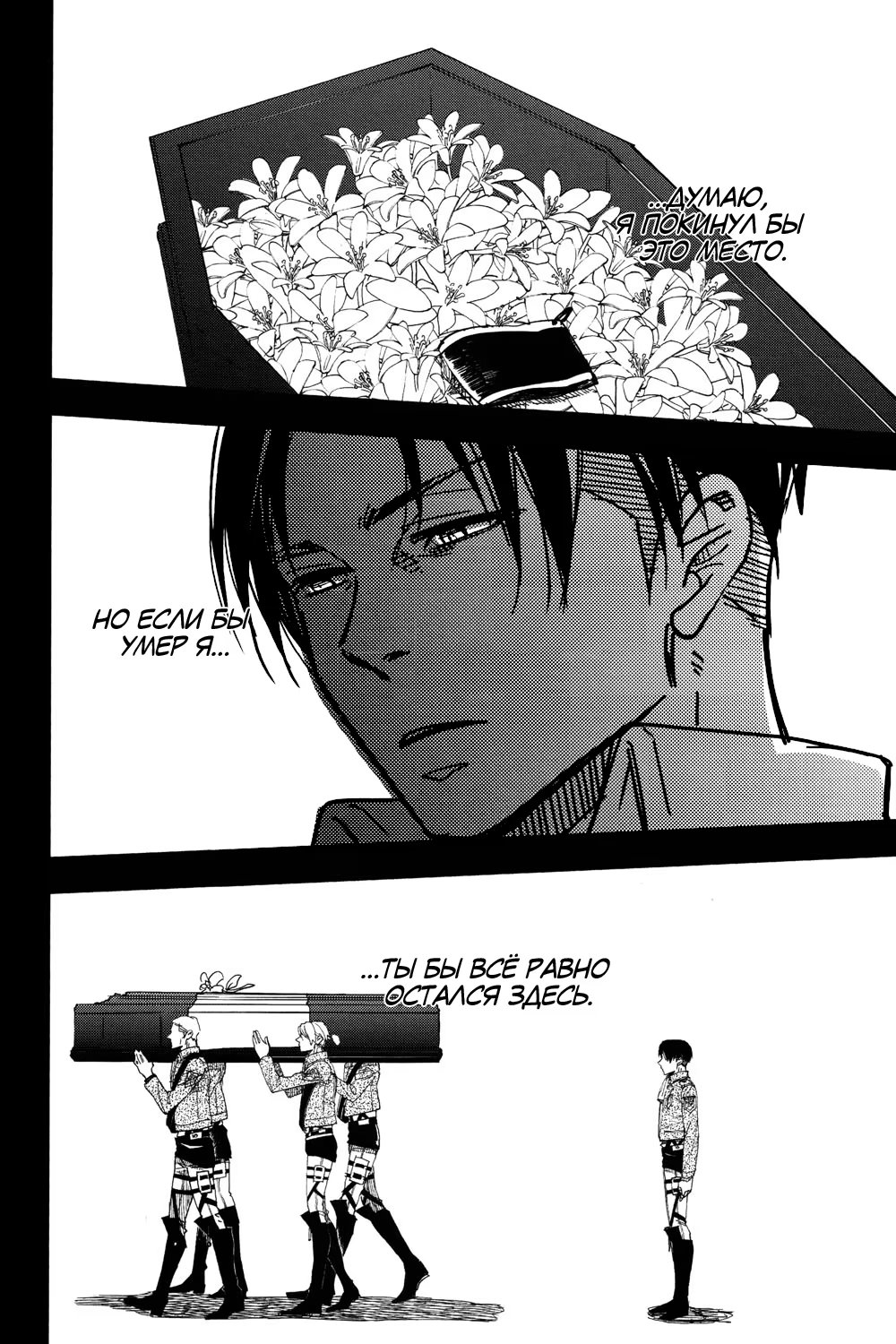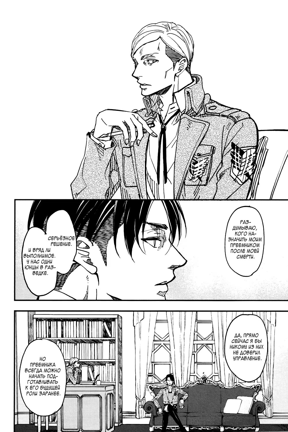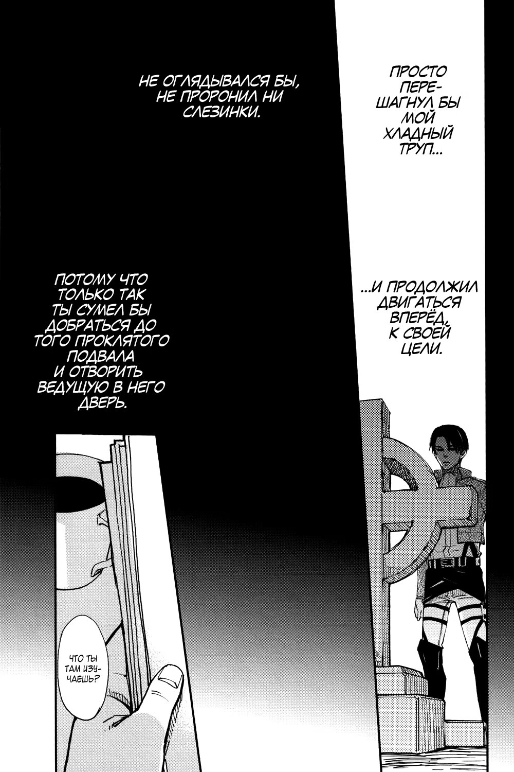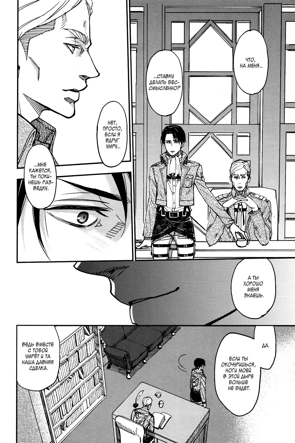 Альтернативное развитие событий: во время очередной миссии Эрвин погибает, и Леви тотчас уходит из Разведкорпуса в неизвестном направлении. Эрен, Микаса, Армин и Жан пытаются хоть как-то стабилизировать хаос, который за этим следует. Но, когда они уже совсем отчаиваются со всем справиться, им неожиданно наносят визит...
