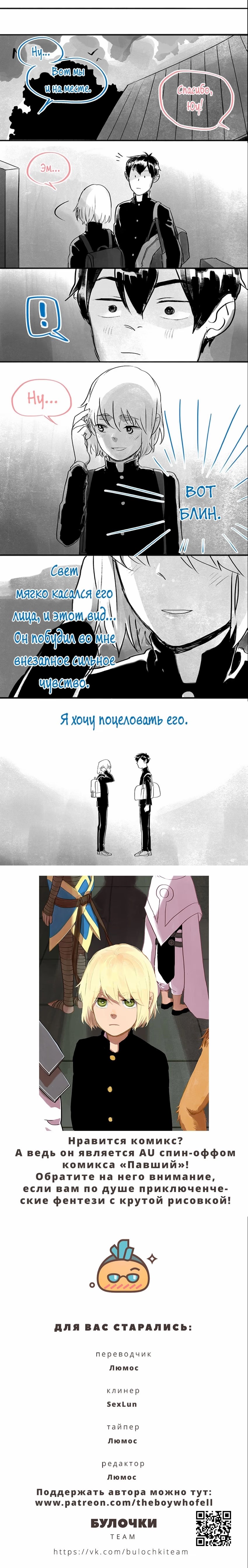булочкиПоклонникам комикса "Павший" и не только представляем мини-комиксы от автора в жанре сенен-ай. Персонажи те же, сюжет совершенно иной, читать можно раздельно. Обязательно зацените комикс, если вам по душе милые и смешные истории о персонажах, за которых одновременно и стыдно, и сердечко пошаливает, и вообще - жиза.