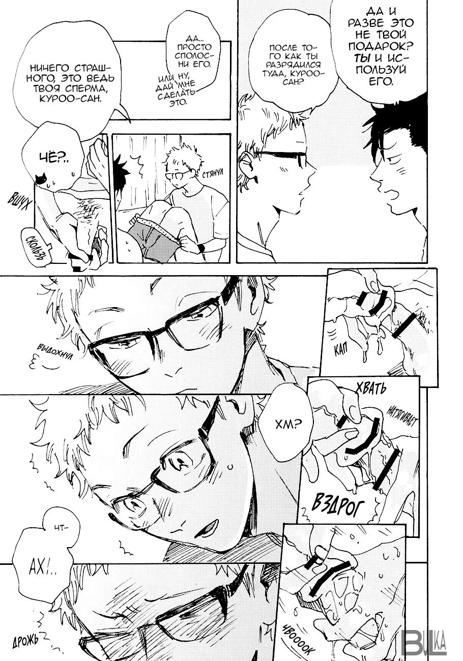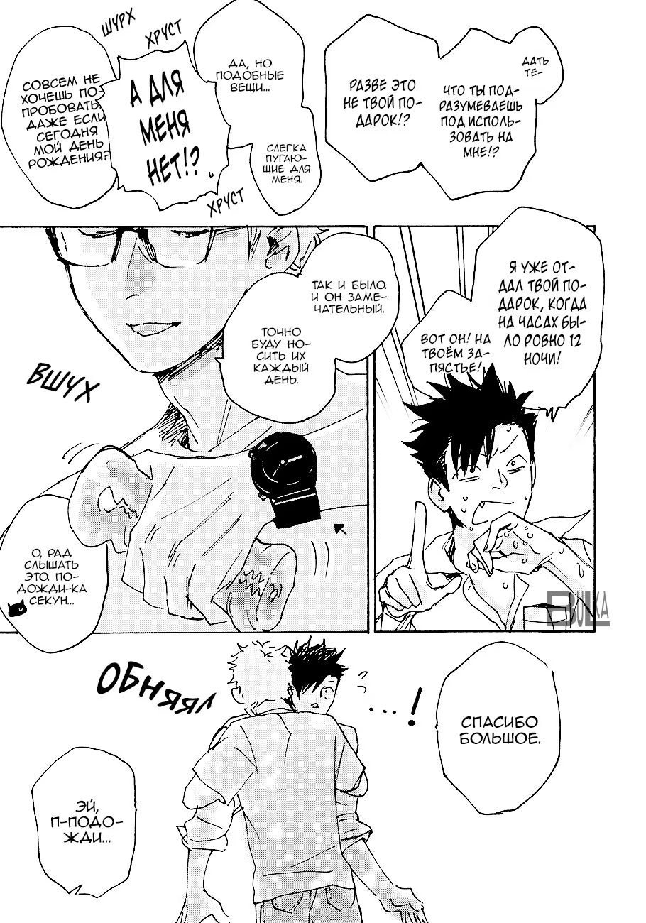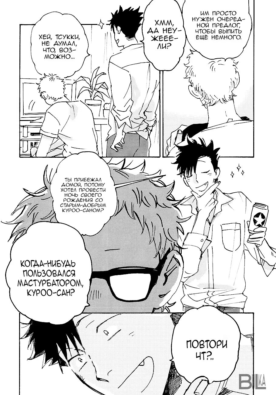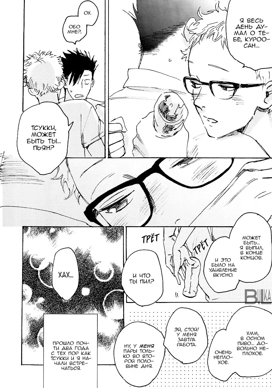 bulkasmyaskomУ Тсукишимы день рождения, но он вернулся с вечеринки очень рано, чем удивил Куроо. Но то, что мегане подготовил для черного кота на вечер заставляет сердце биться чаще. Немного повседневности от работающего в офисе Куроо-сана и студента Тсукишимы.