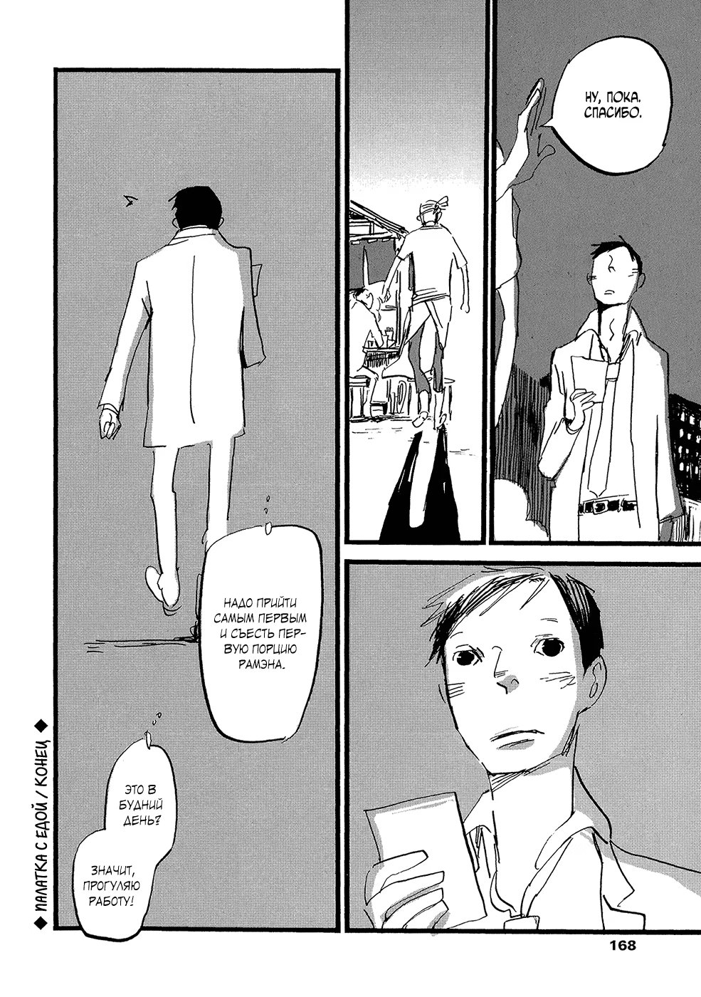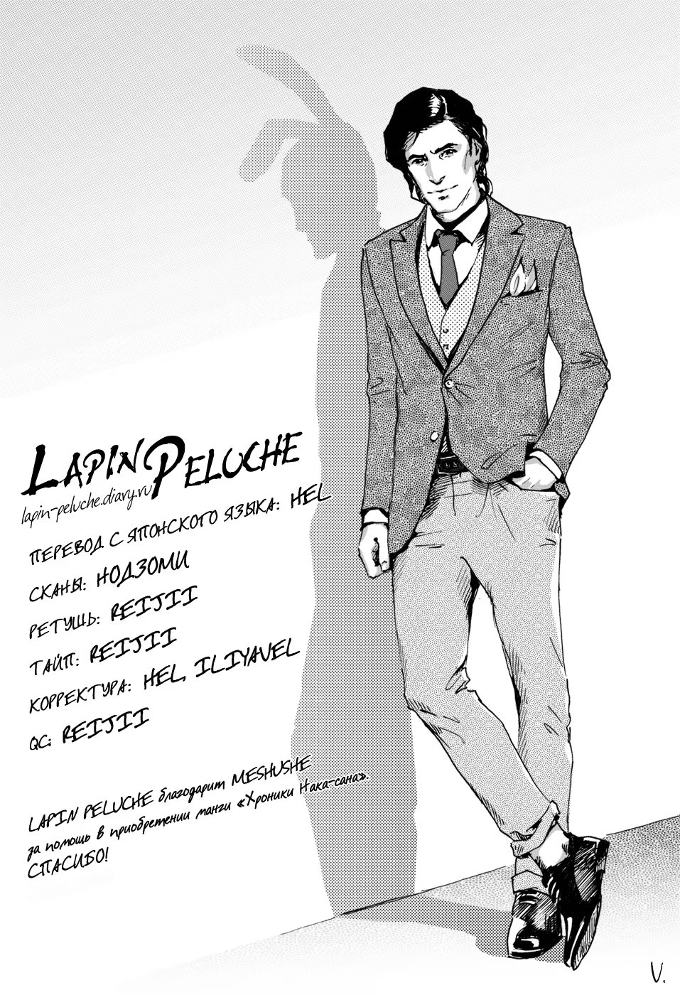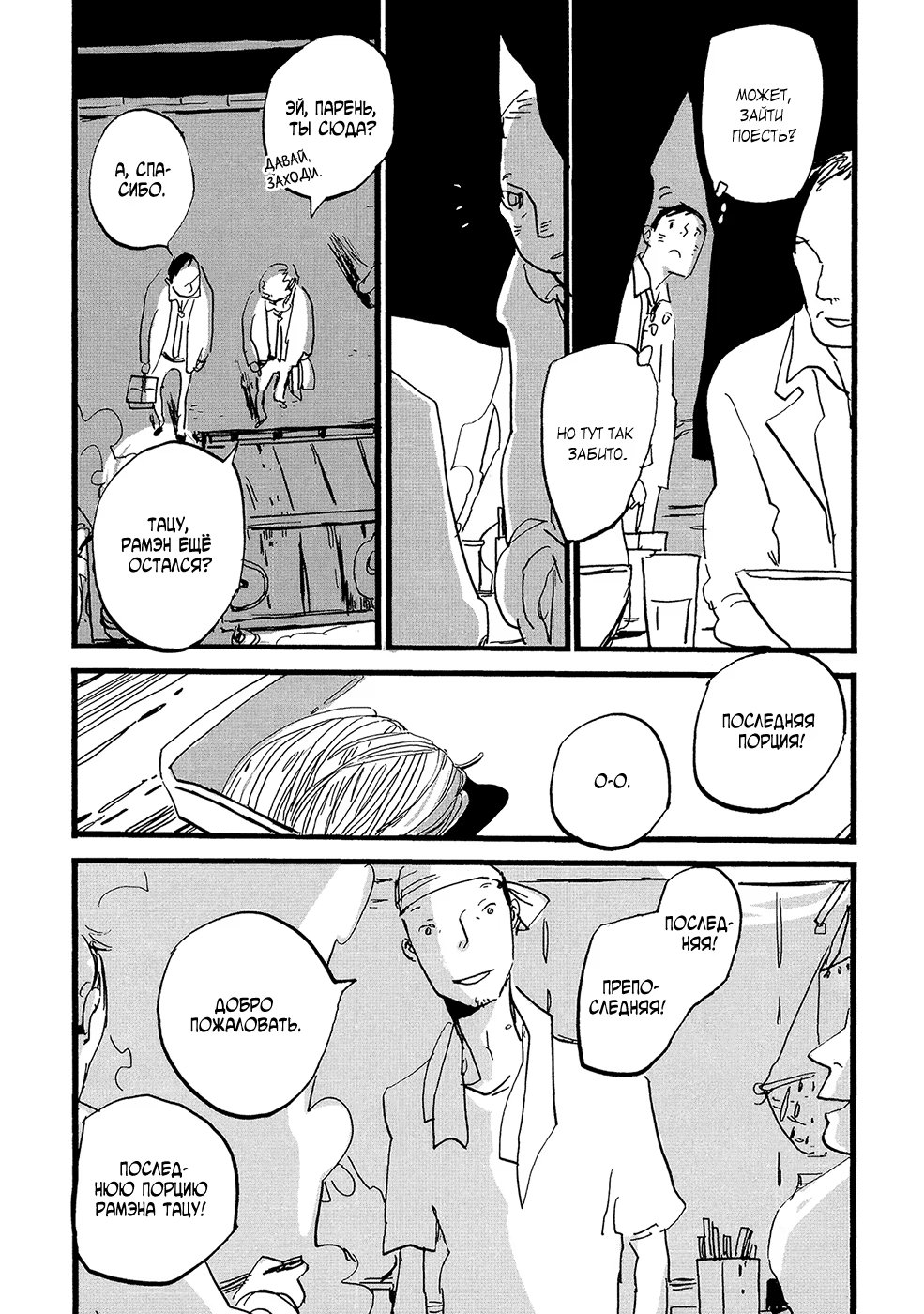 lapin pelucheЗамечательная повседневная жизнь владельца рамэнной, который беспокоится о своём здоровье, Нака-сана, его любовника и постоянного клиента ресторанчика, Мацусин-куна, и всех людей, которые их окружают. Также в сборник включена вторая история, «Чернее чёрного», о Ята-сане, который заботится о своих волосах.