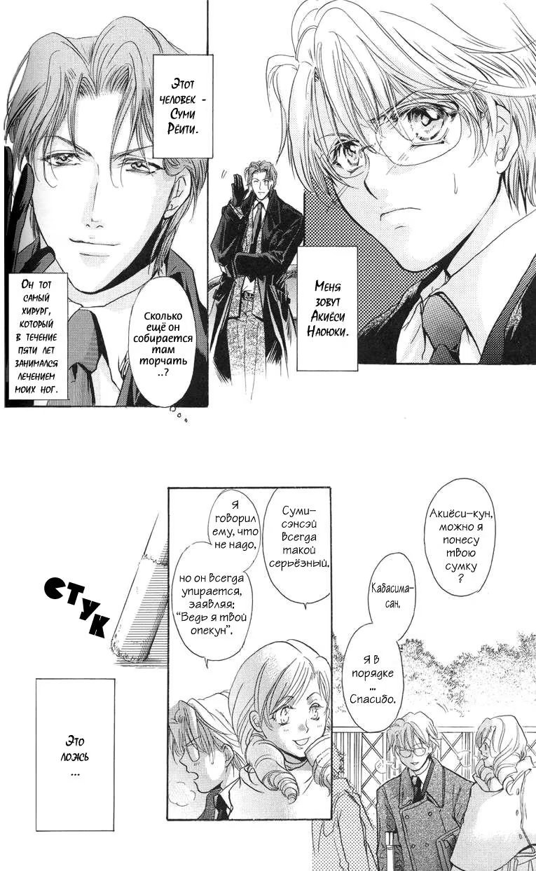 Суми Рёити - талантливый хирург, работающий в больнице университета Кото. Акиёси Наоюки - 18-летний мальчишка, лишённый способности нормально ходить, перенёсший большое количество операций... Так распорядилась судьба, что в результате несчастного случая Наоюки не только потерял возможность быть нормальным здоровым человеком. У него погибли родители. Рёити взял мальчика под свою опеку... но только ли поэтому ему так дорог этот капризный до эгоизма пациент?..