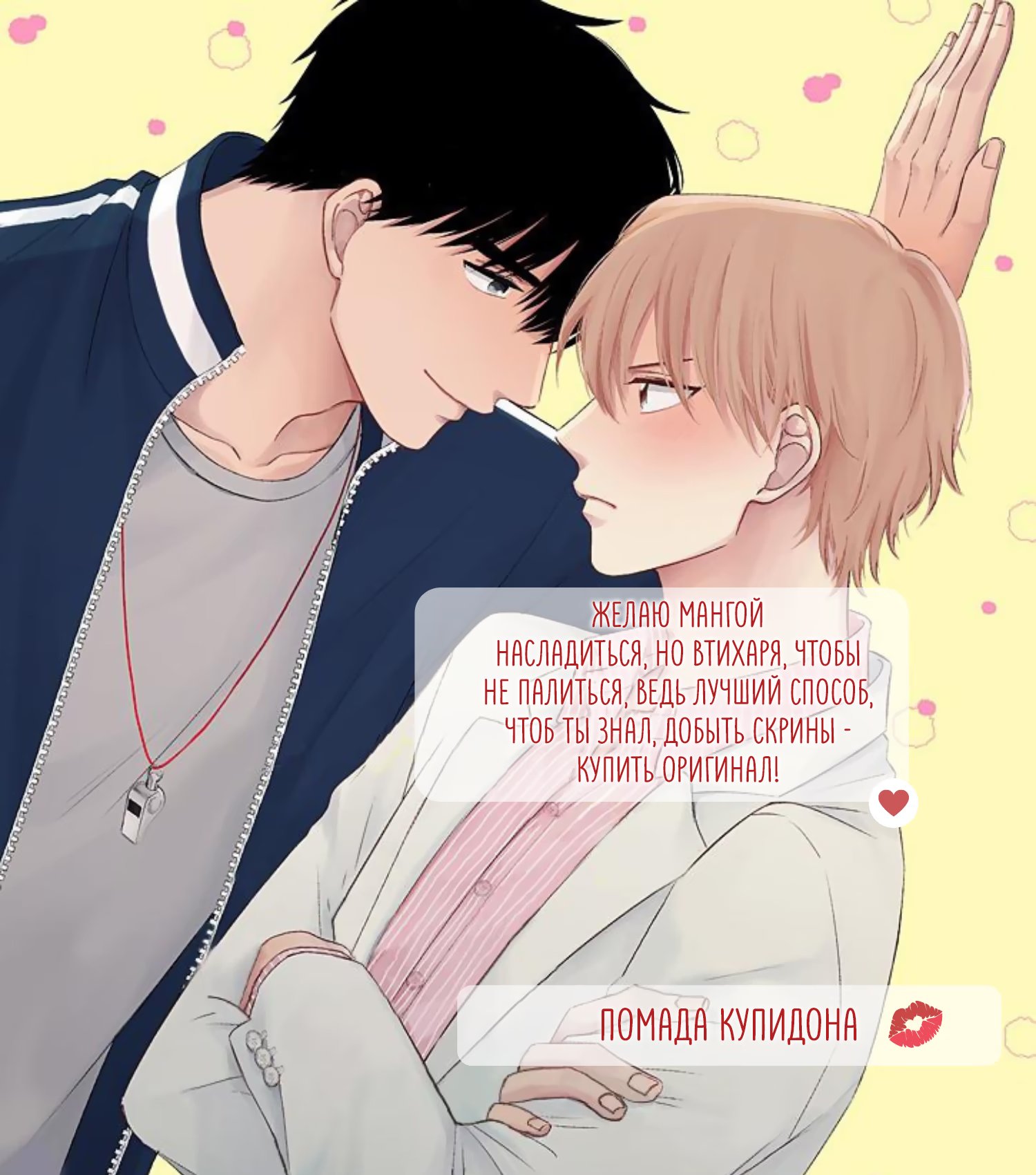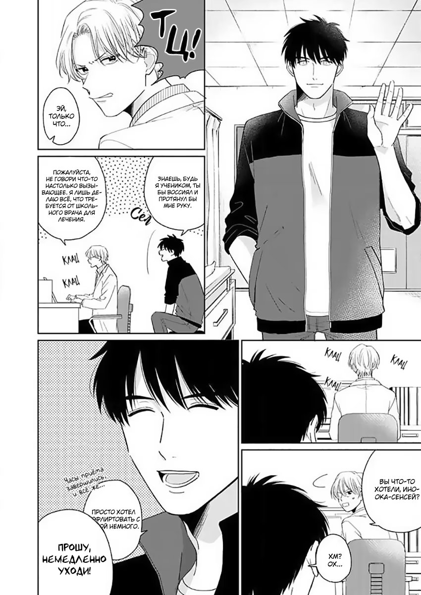 помада купидонаФудзисиро - школьный врач, которому нравятся милые мальчики. Он живет очень счастливой жизнью в окружении ангелочков (старшеклассников), но есть одна проблема... На самом деле, у него физические отношения с Иноокой, учителем физкультуры, но дело в том, что его коллега ужасно раздражает его...