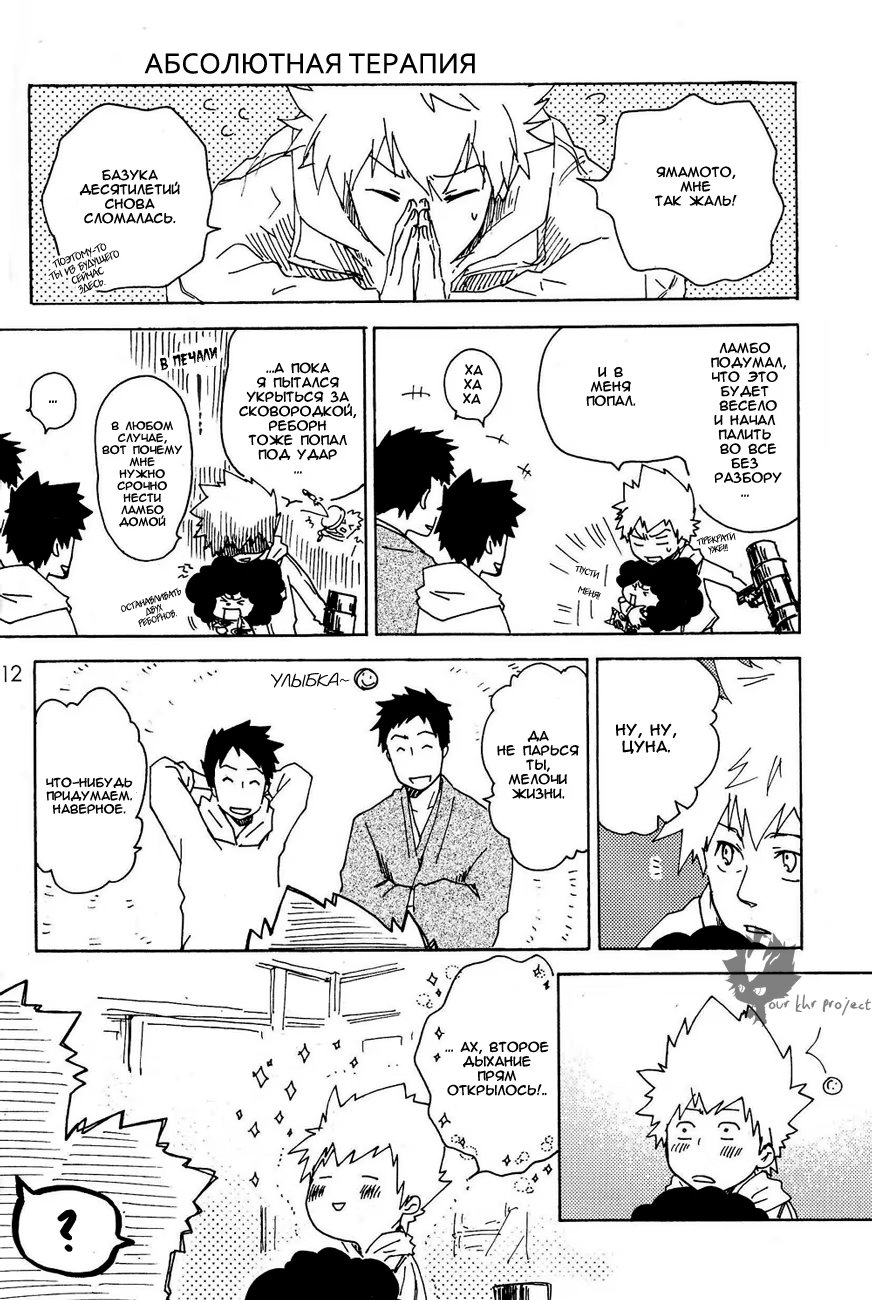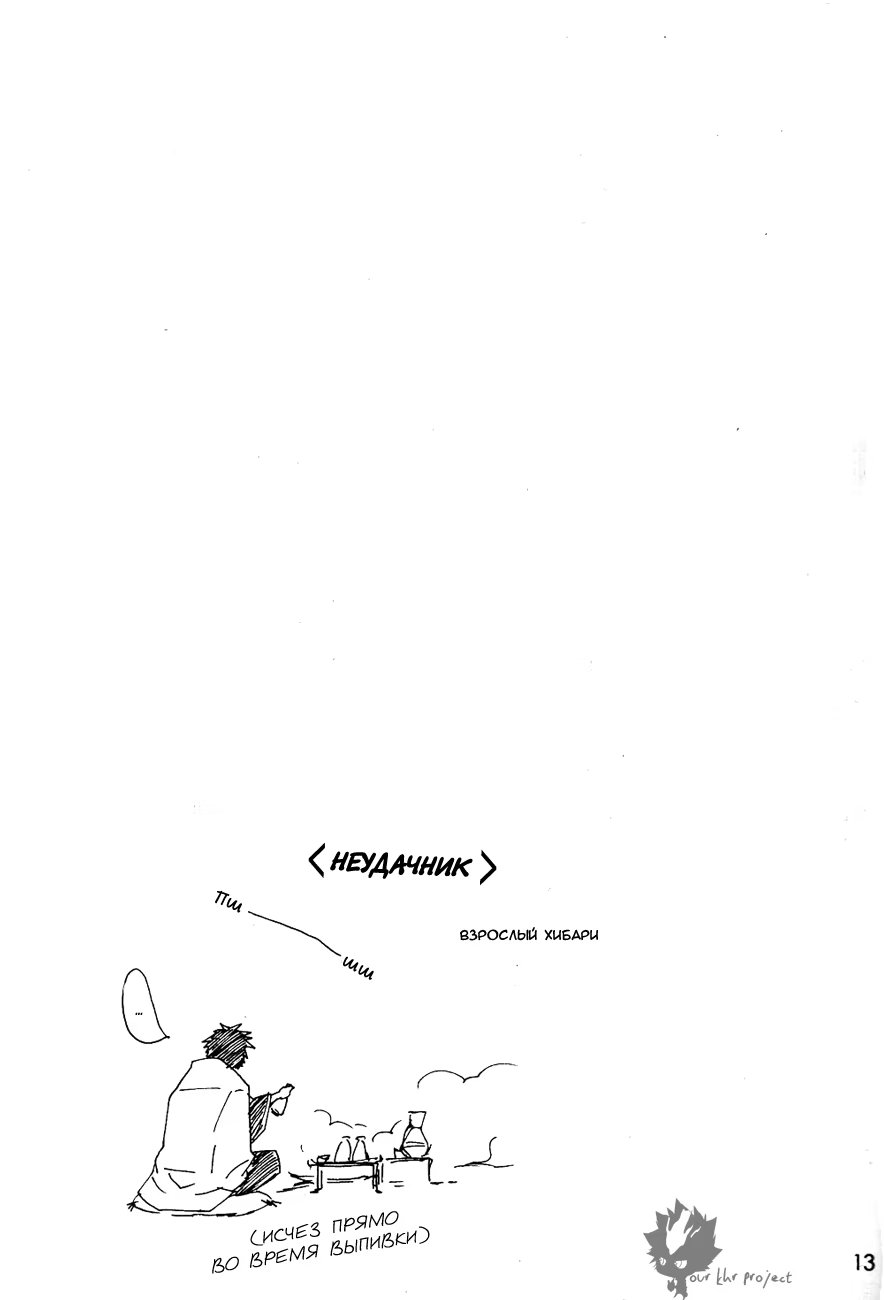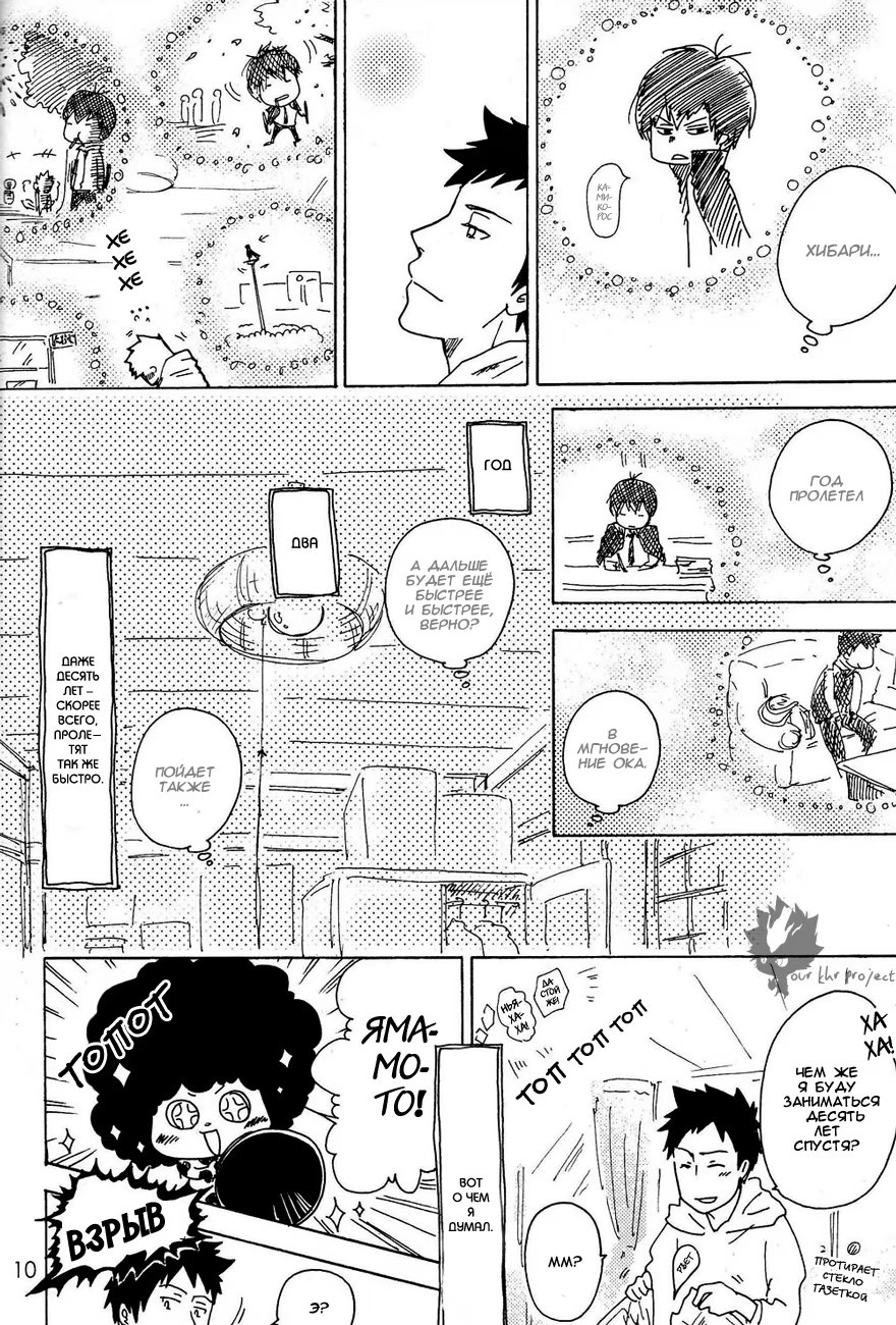 Ламбо опять баловался с пушкой десятилетия и она сломалась. Под удар попали и Такеши с Хибари, пизвав из параллельного мира взрослых себя самих. Как развивались дальнейшие отношения оригиналов и их великовозрастных копий и предстоит узнать читателю.