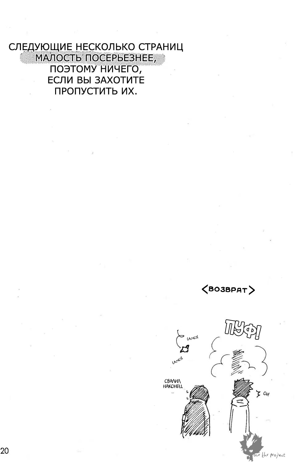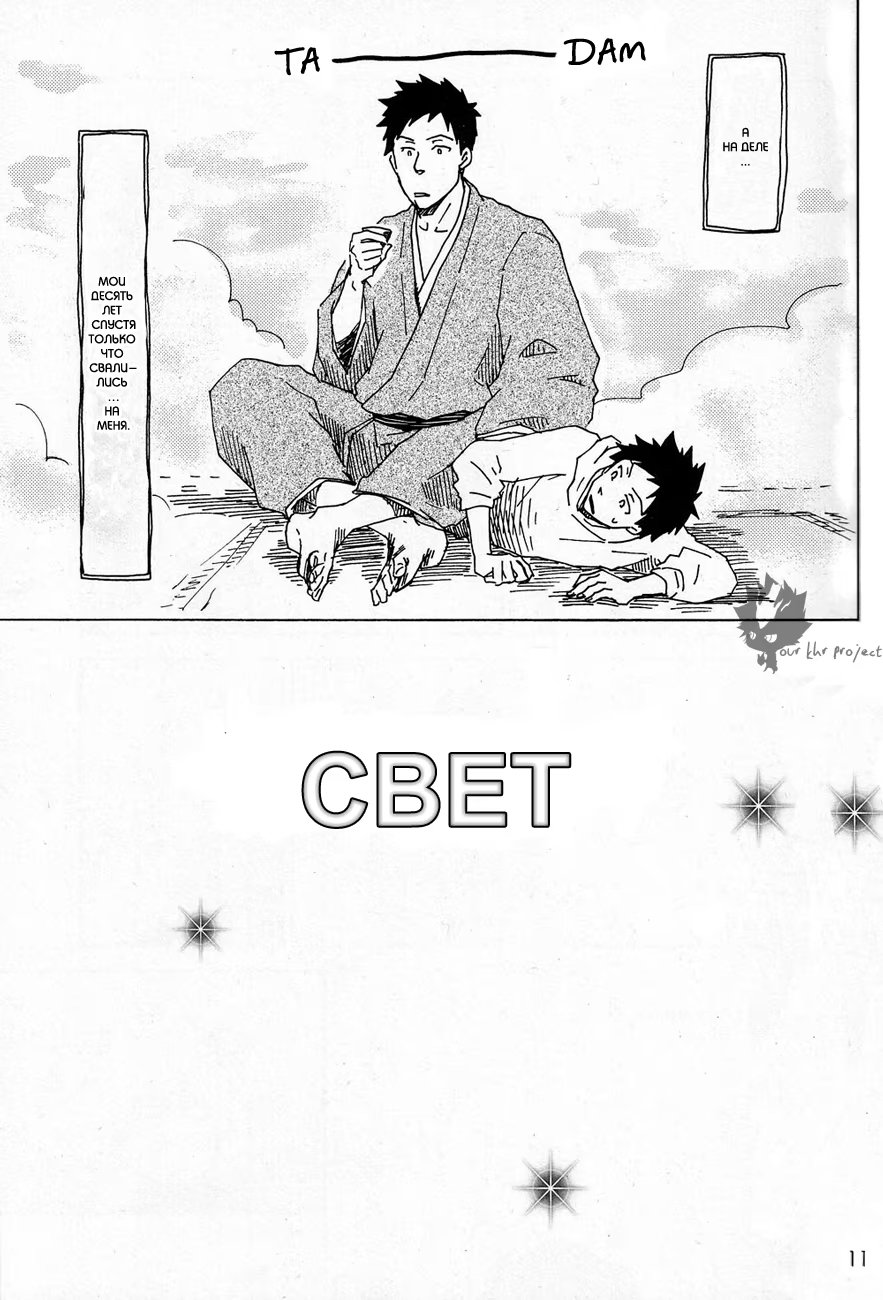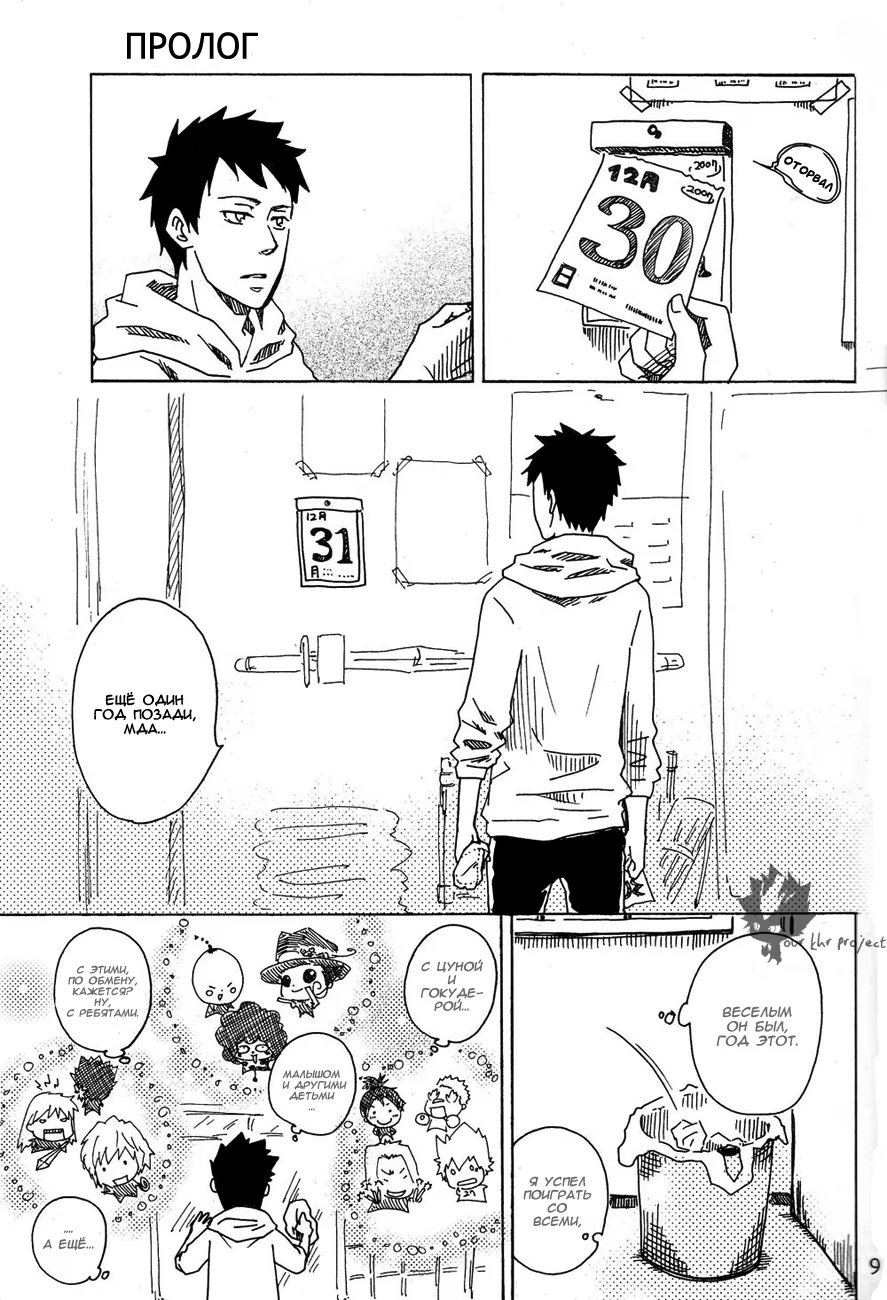 Ламбо опять баловался с пушкой десятилетия и она сломалась. Под удар попали и Такеши с Хибари, пизвав из параллельного мира взрослых себя самих. Как развивались дальнейшие отношения оригиналов и их великовозрастных копий и предстоит узнать читателю.